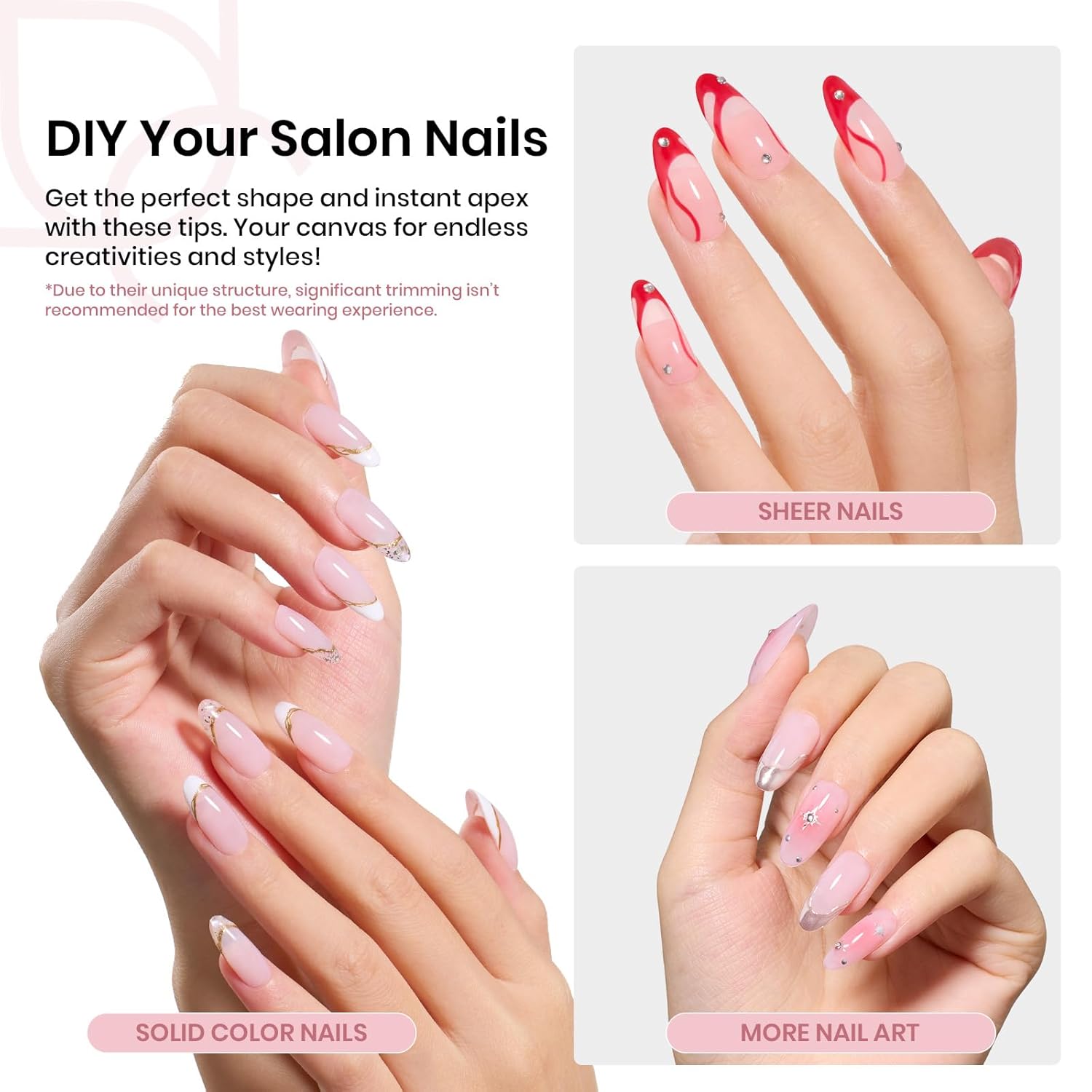 • One-Step Nail Building, Long-Lasting Results:Includes 192 tips in 16 sizes to fit over 95% of clients. Apply with solid glue gel—no acrylic, dip, or builder gel needed. These durable tips give you smooth, bubble-free nails that last 3 weeks without yellowing or lifting.