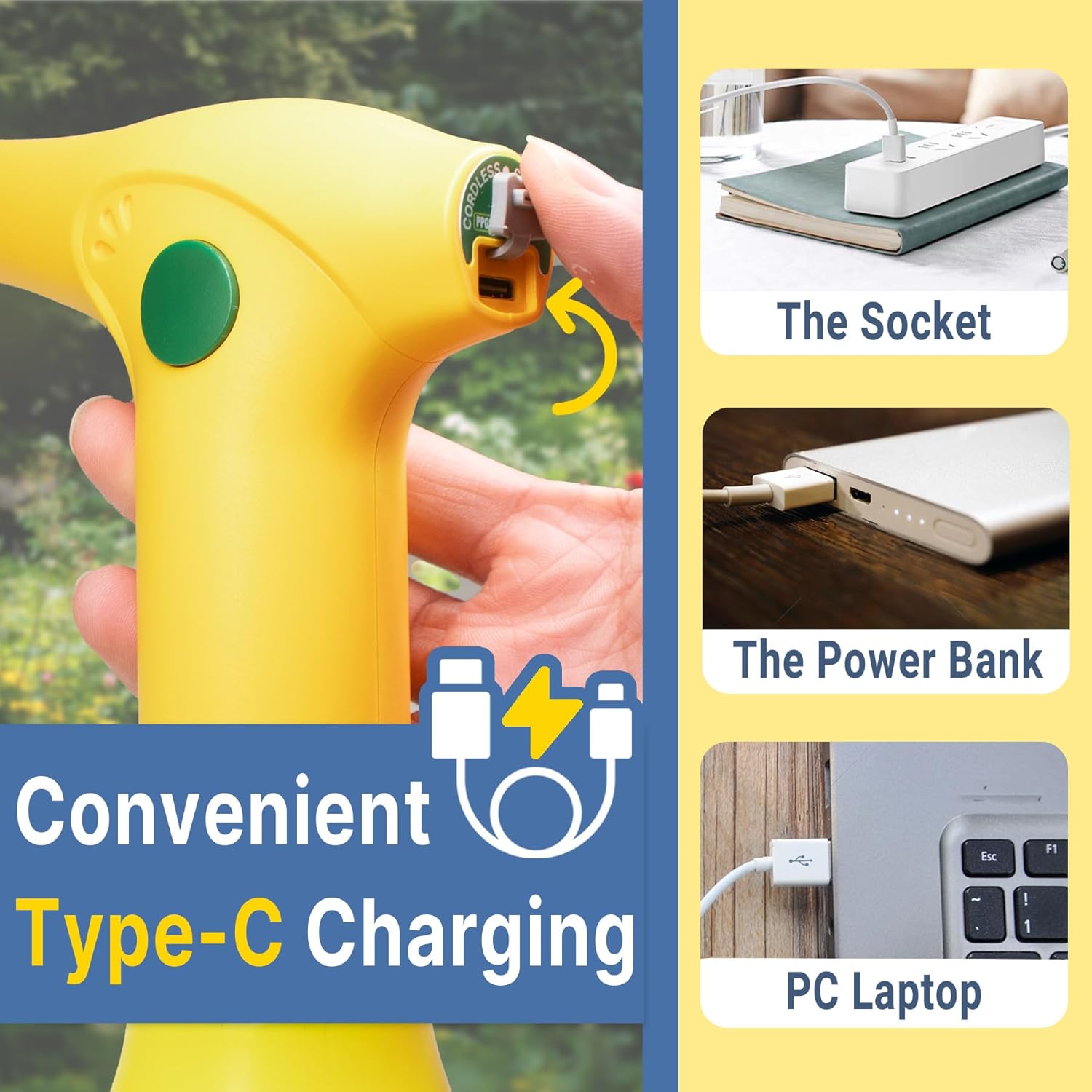 • 【Rechargeable & Last Long】This electric sprayer bottle comes with a Type-C USB cable but CHARGER IS NOT INCLUDED. The charge port hidden on the handle is well covered for watering-proof consideration. Charging the battery to full will last this electric plant sprayer working for a long time.