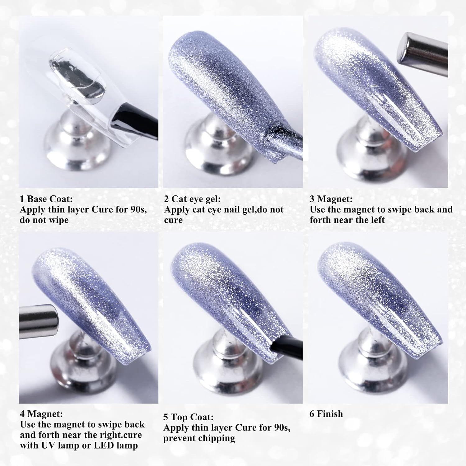 • Tip -This Cat Eye Gel Polish need use magnet to get cat eye effect. And need to apply a base coat, two layers of gel polish, and a top coat for best results.