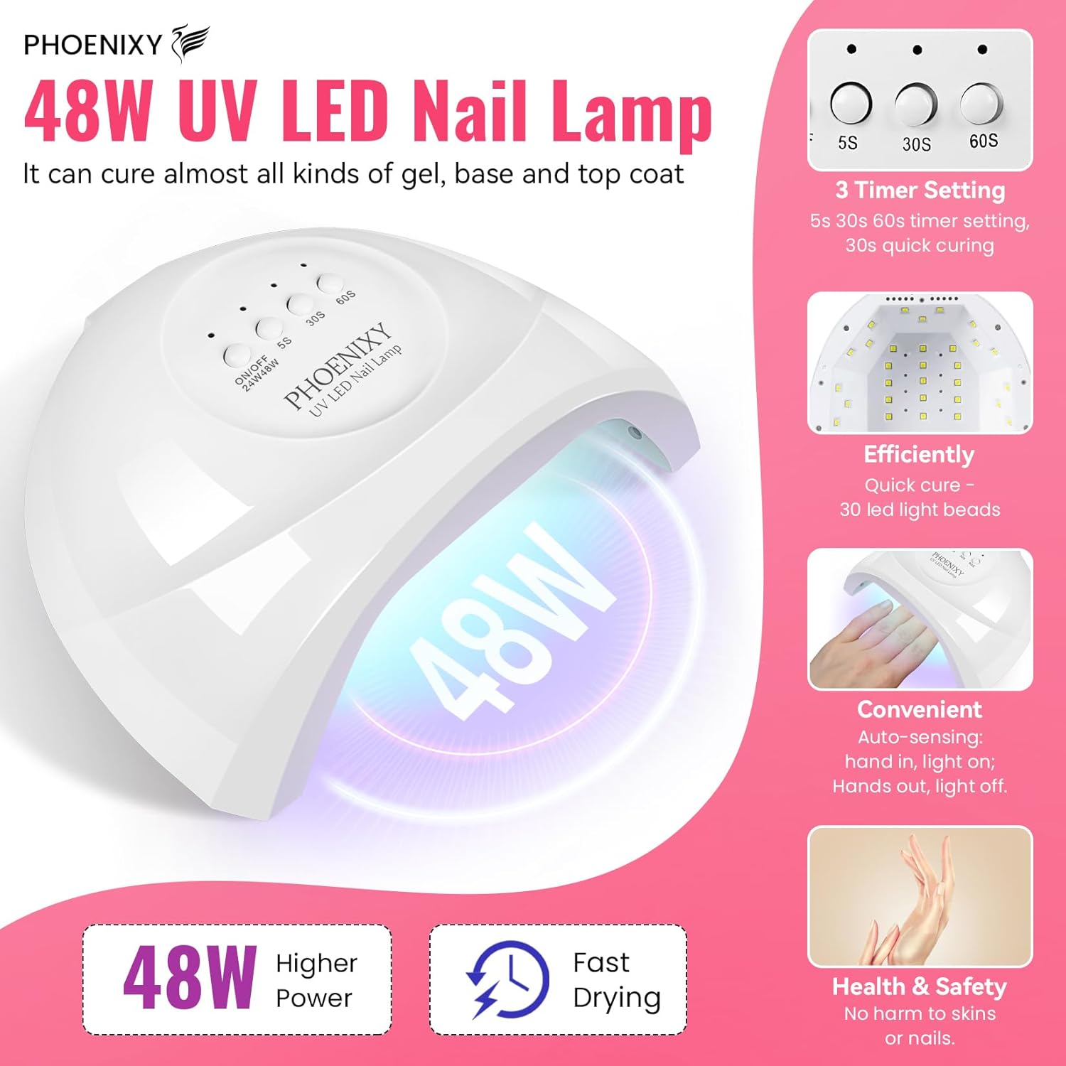 • [Phoenixy Gel Nail Polish Kit with Nail Light]: 35 colors gel nail polish, 5 base and top coat, 48W U V nail light, nail drill, nail decorations and other manicure tools. A cost-effective kit for manicure beginners and salon with everything you need. With some practice, you can get beautiful nail art for all seasons and occasions- parties, holidays, work or daily life.