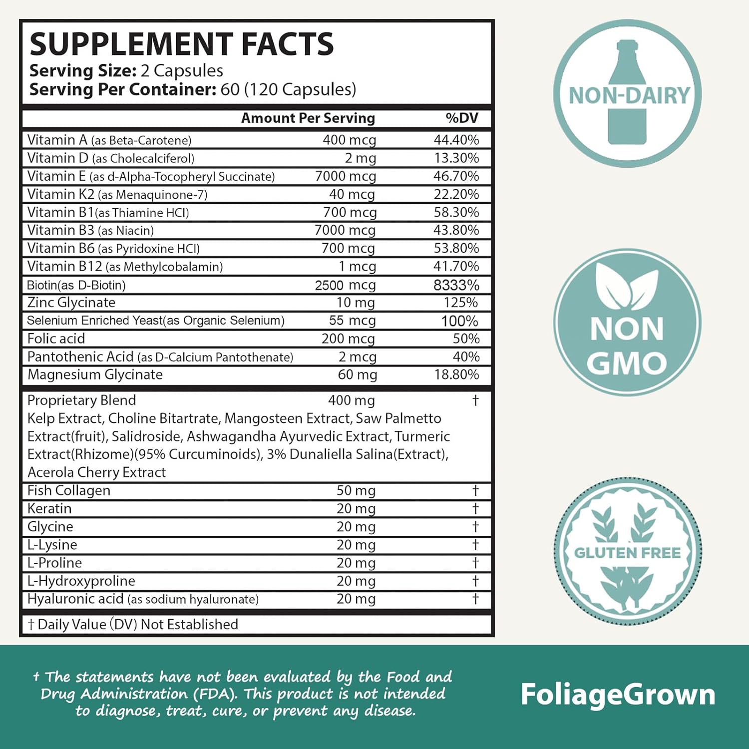 • Biotin 2500 mcg : Plant and algae extracts, along with amino acids, in FoliageGrown's unique formula provide comprehensive scalp care, improving moisture, elasticity, and environmental protection for a healthy, youthful look