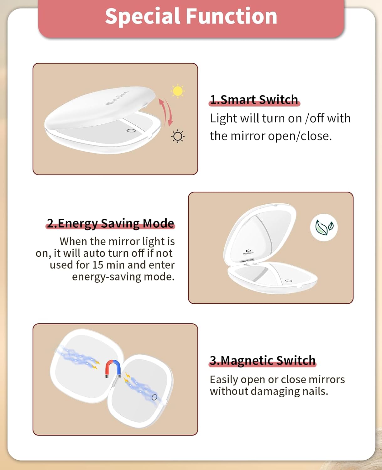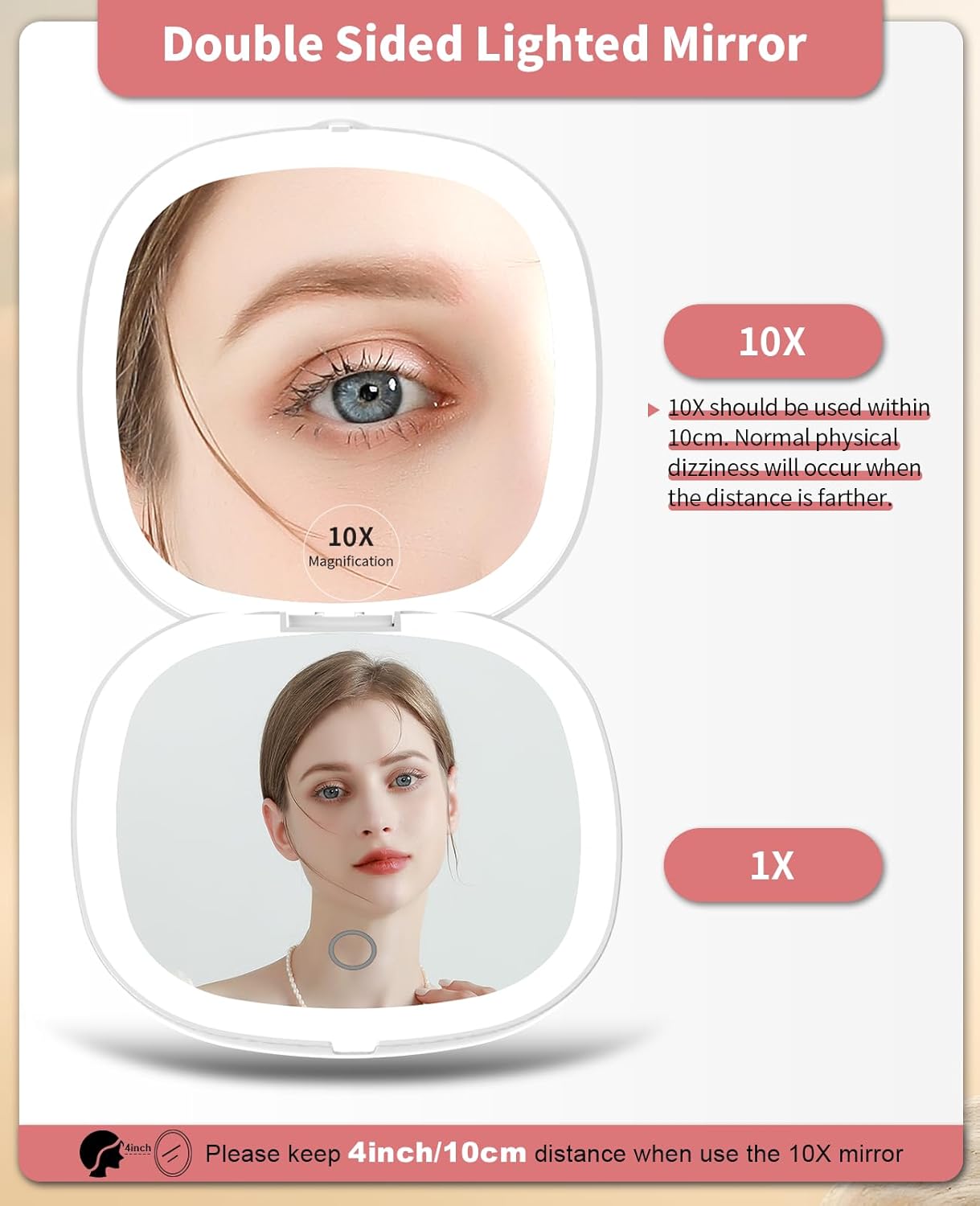 • 10x Magnifying:One side is a 1x HD mirror, equipped with white light to better restore your beauty, and the other side is a 10x magnifying mirror, which can help you magnify facial details. Tip: When using the 10x magnifying mirror, please keep a distance of less than 10 cm, otherwise it may cause normal dizziness and affect imaging