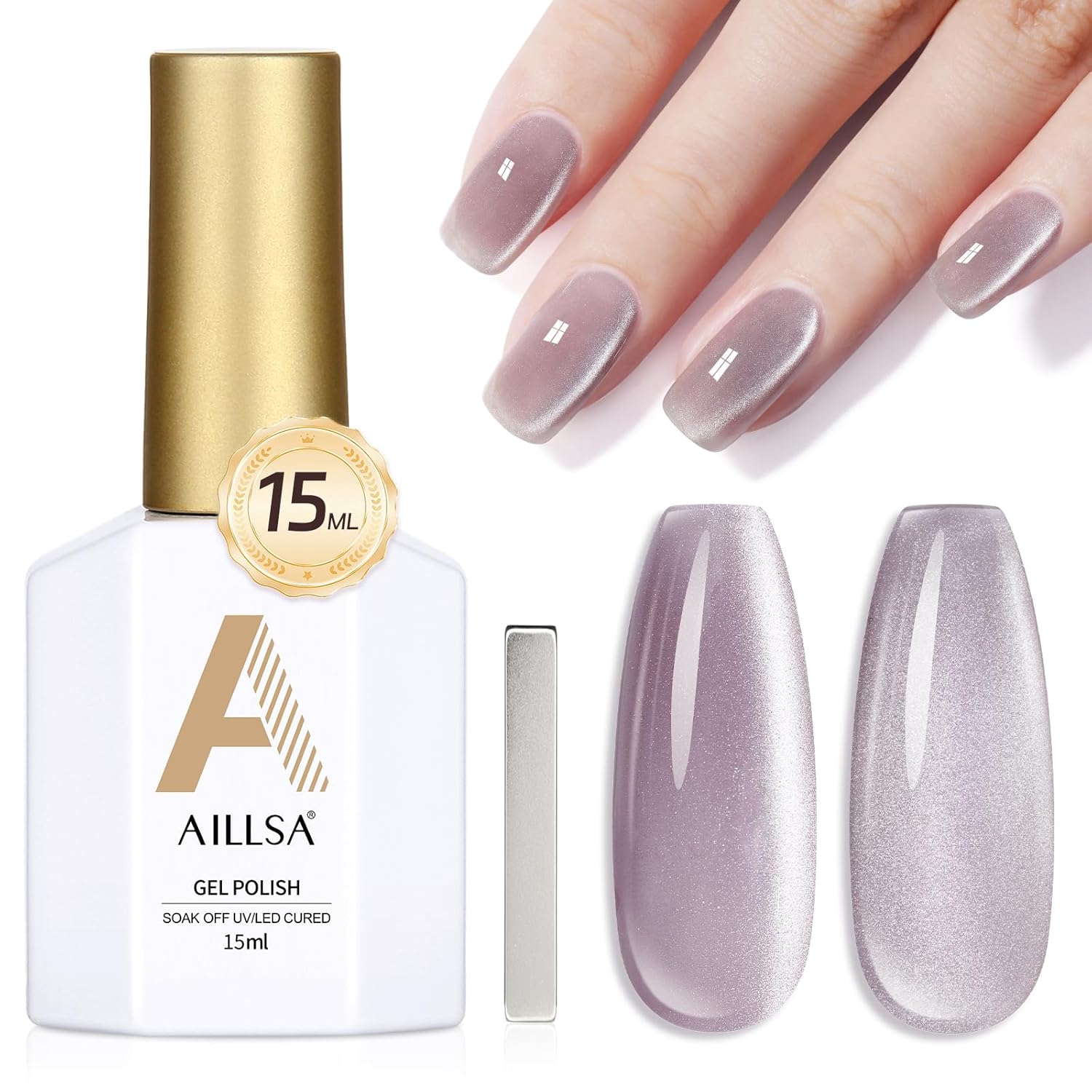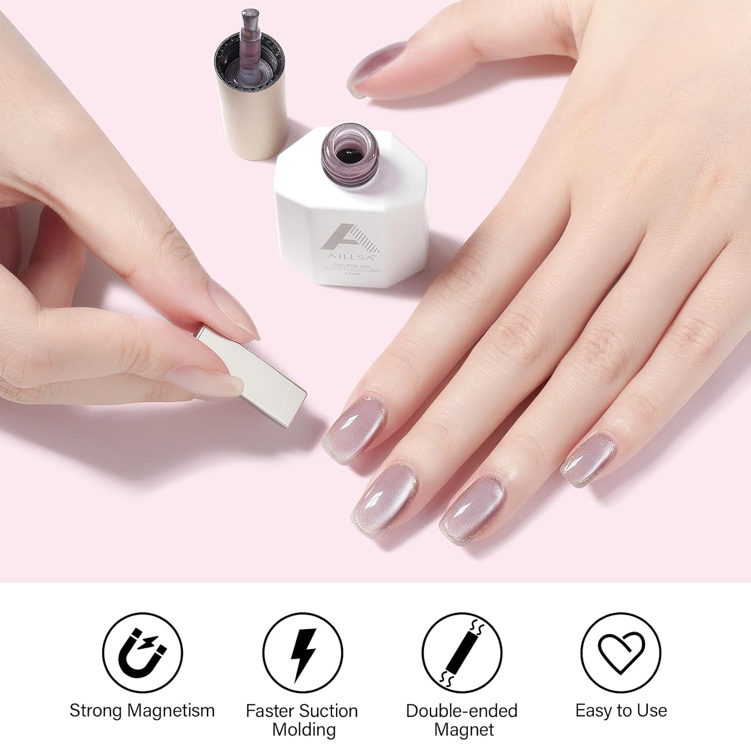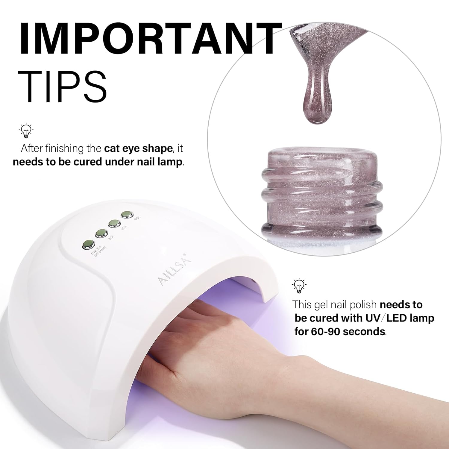 • CRYSTAL SPARKLING EFFECT - AILLSA Cat Eye Gel Nail Polish has a dense magnetic powder that can be used alone for a mirror-shimmering, crystal-clear manicure or with any base color nail polish, jelly gel nail polish, and other nail polishes.