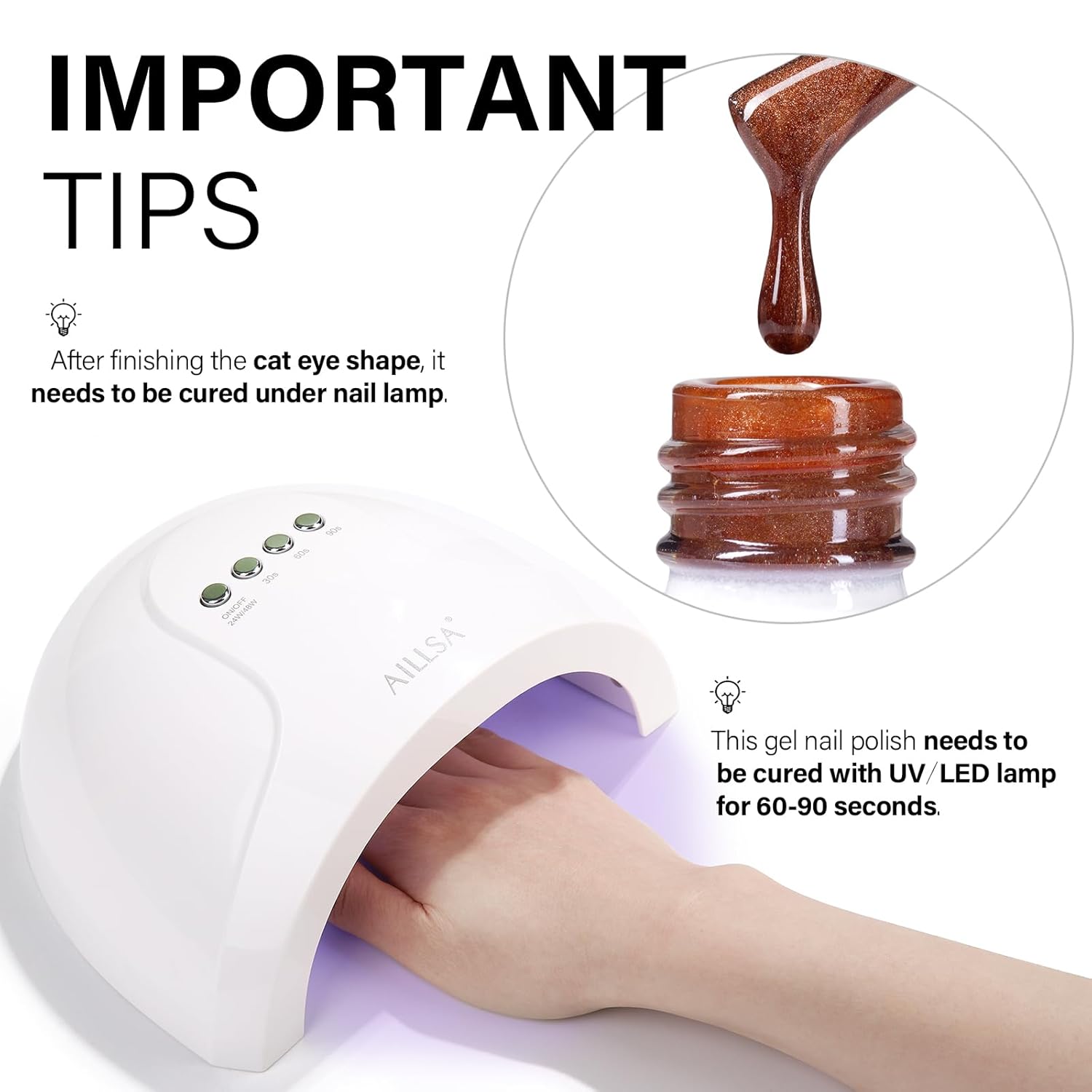 • LONG LASTING SHINE - AILLSA amber gel polish needs to be cured under U V lamps, and with the right application procedure, it can last 21-28 days to maintain the glittery shine. You no longer have to worry about your nails peeling off in the shower or while doing chores.