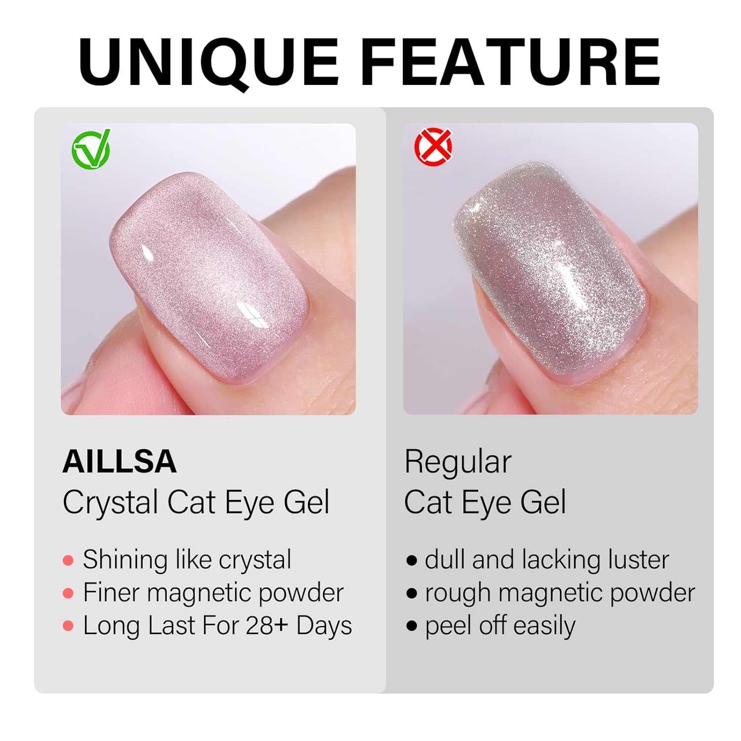 • CRYSTAL SPARKLING EFFECT - AILLSA Cat Eye Gel Nail Polish has a dense magnetic powder that can be used alone for a mirror-shimmering, crystal-clear manicure or with any base color nail polish, jelly gel nail polish, and other nail polishes.