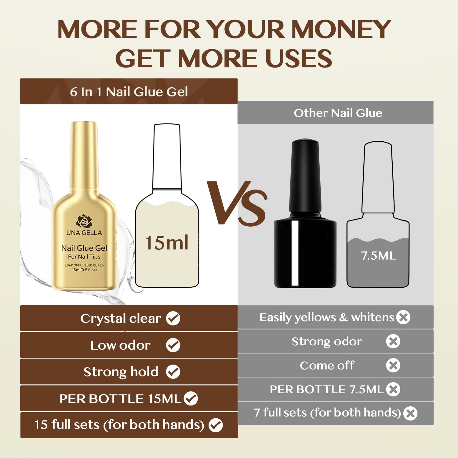 • ❤️【Suit All Kinds of Nail Tips】UNA GELLA Gel Nail Glue is suitable for clear nail tips, acrylic nails, and soft gel tips, offering ultra-strong adhesion.