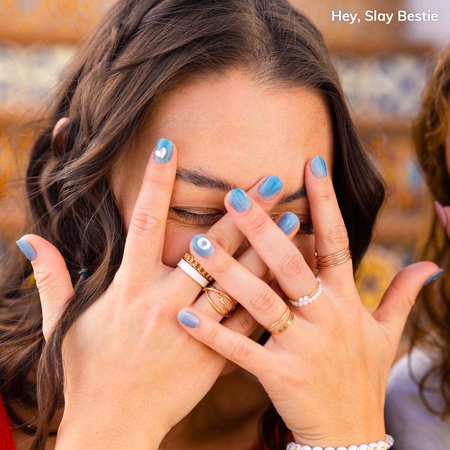 Semi Cured Gel Nail Strips | No LED Lamp Needed | Solid, Blue | Easy Apply & Remove, Salon Quality | Includes 28 Strips, 1 Prep Pads, Nail File & Wooden stick - Hey, Slay Bestie