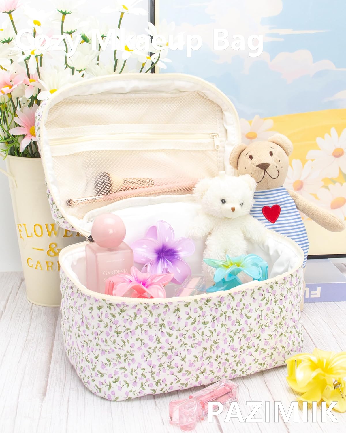 PAZIMIIK Quilted Makeup Bag Large Travel Zipper Soft Cosmetic Case for Women Girls Make Up,Floral Purple