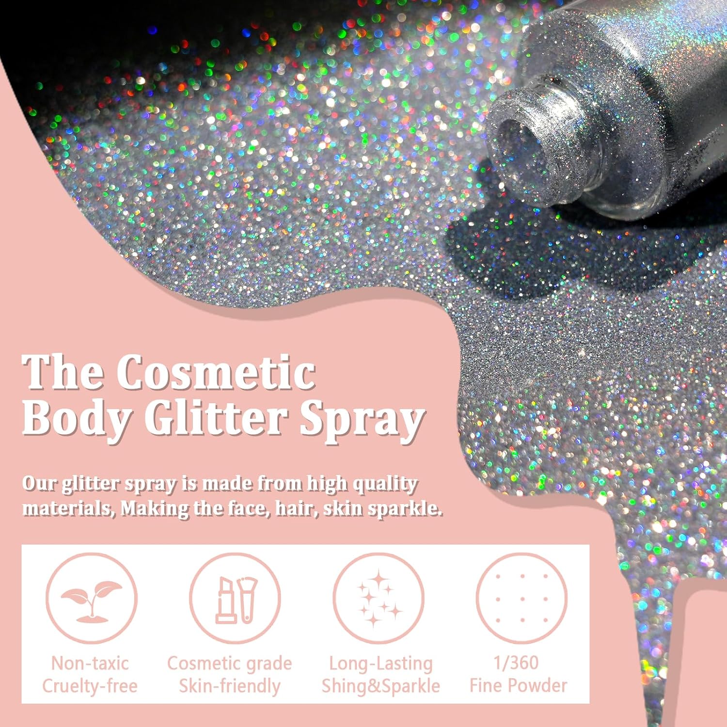 Boko Body Glitter Spray, Holographic Silver Glitter Spray for Body Face Hair Nail Clothes, Hair Glitter Body Shimmer Powder for Highlighter Makeup Festival Party Concert Rave Accessories