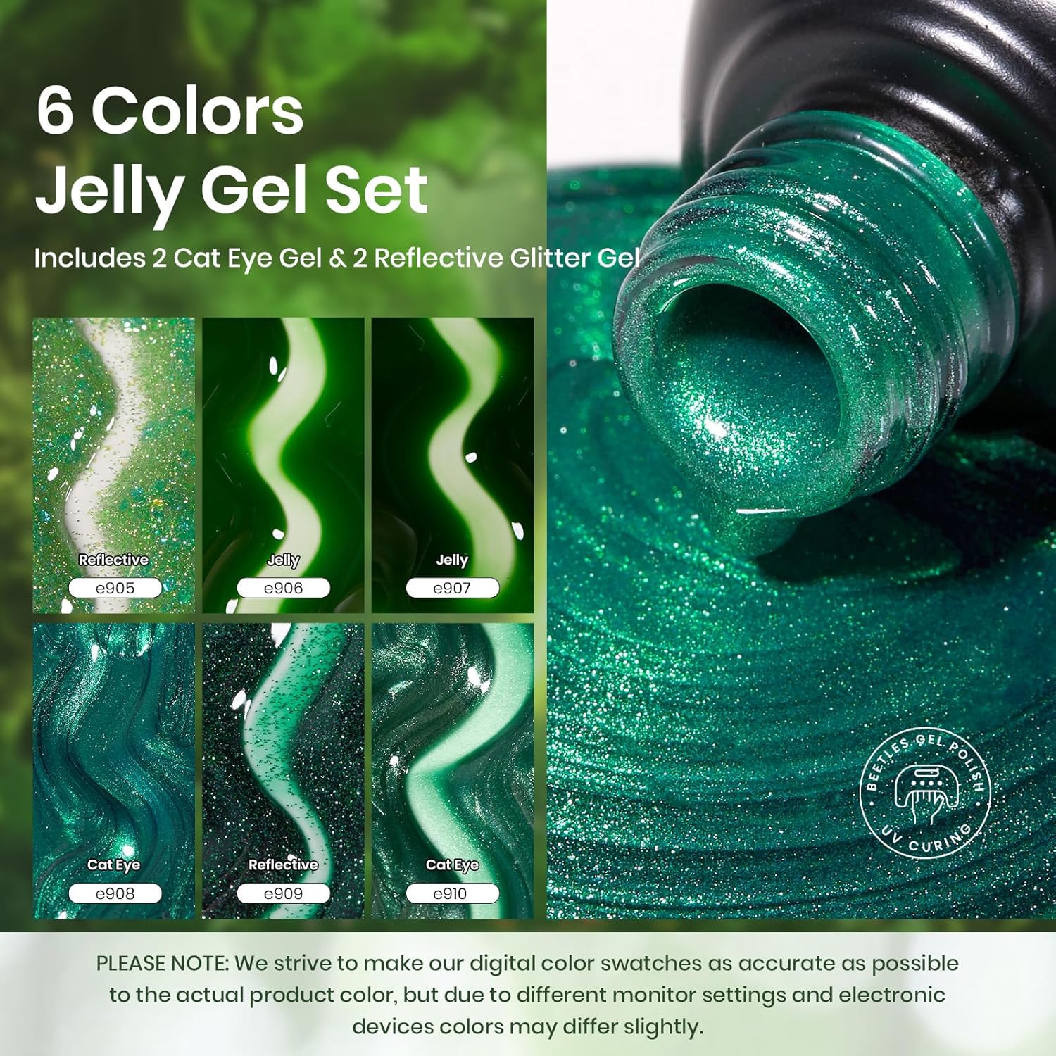 beetles Gel Polish Christmas Green Gel Nail Polish Set Cat Eye Jelly with Color Swatch Dots Magnet 6 Color Glitter Enchanted Forest Theme for Salon Manicure Nail Art DIY at Home Gift for Women Girls