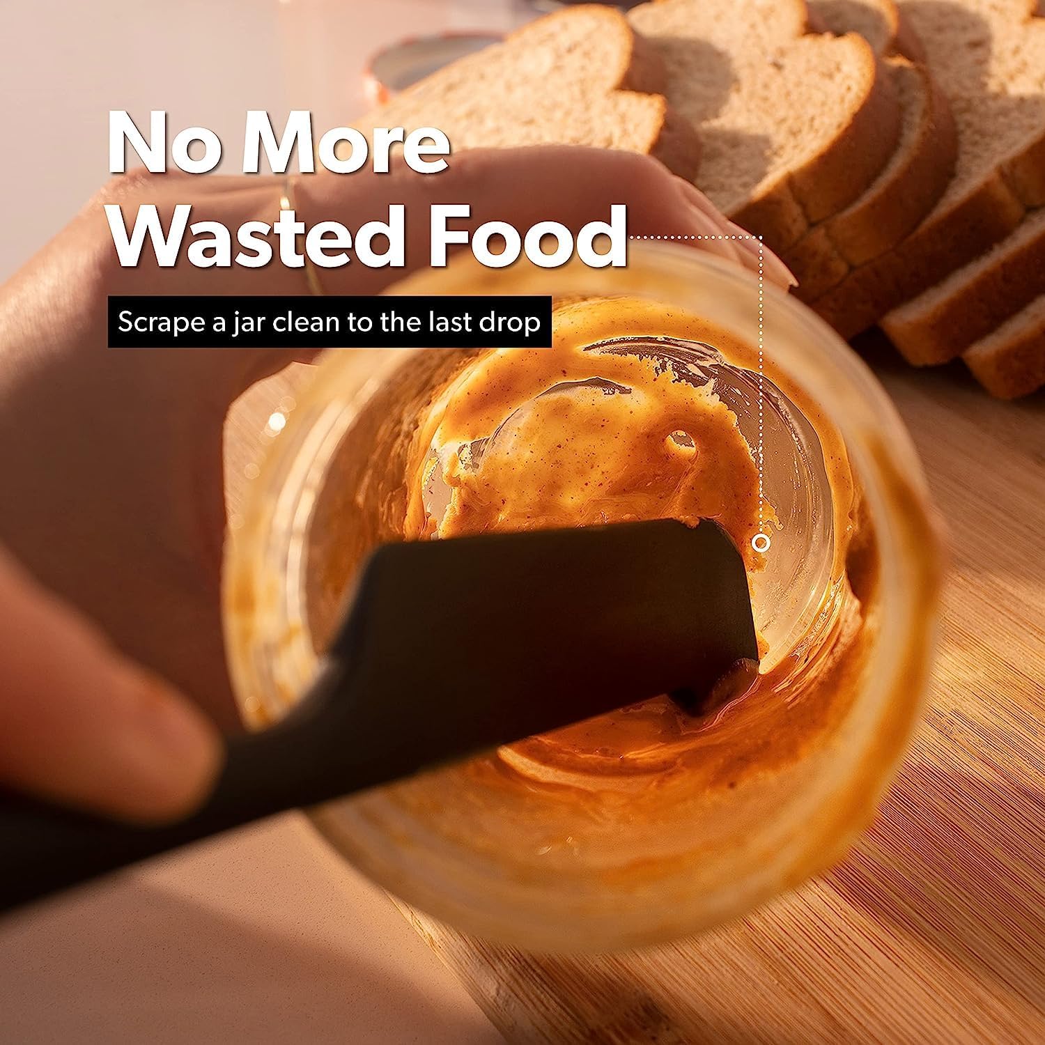 • ELIMINATES WASTED FOOD - Our innovative and revolutionary design ensures you can pick a jar or blender clean without getting your hand in the food. Unlike cheap plastic utensils that are ineffective at getting too hard to reach spots in a jar or blender, we have created silicone spatulas that will easily and completely remove mayo, peanut butter, and other foods hassle free, to the last drop. The result, no more wasted food.