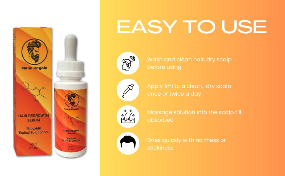 • EXTRA STRENGTH: Mane Regain Minoxidil Topical Solution USP, 5 Percent is an extra strength solution for men to help regrow hair; includes an easy to use dropper