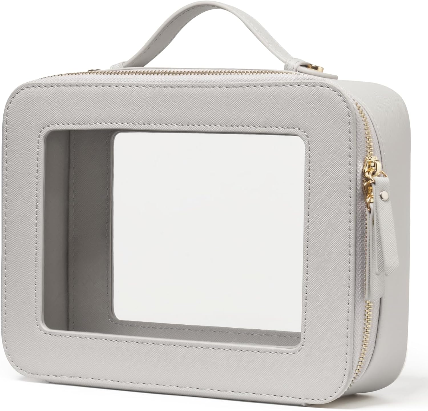 • [Premium Quality] - This clear small cosmetic case is crafted from high-grade saffiano faux leather, making it highly scratch-resistant, durable, and easy to clean. It features a smooth zipper for secure closure and elegant light gold metal accents for a luxurious touch.