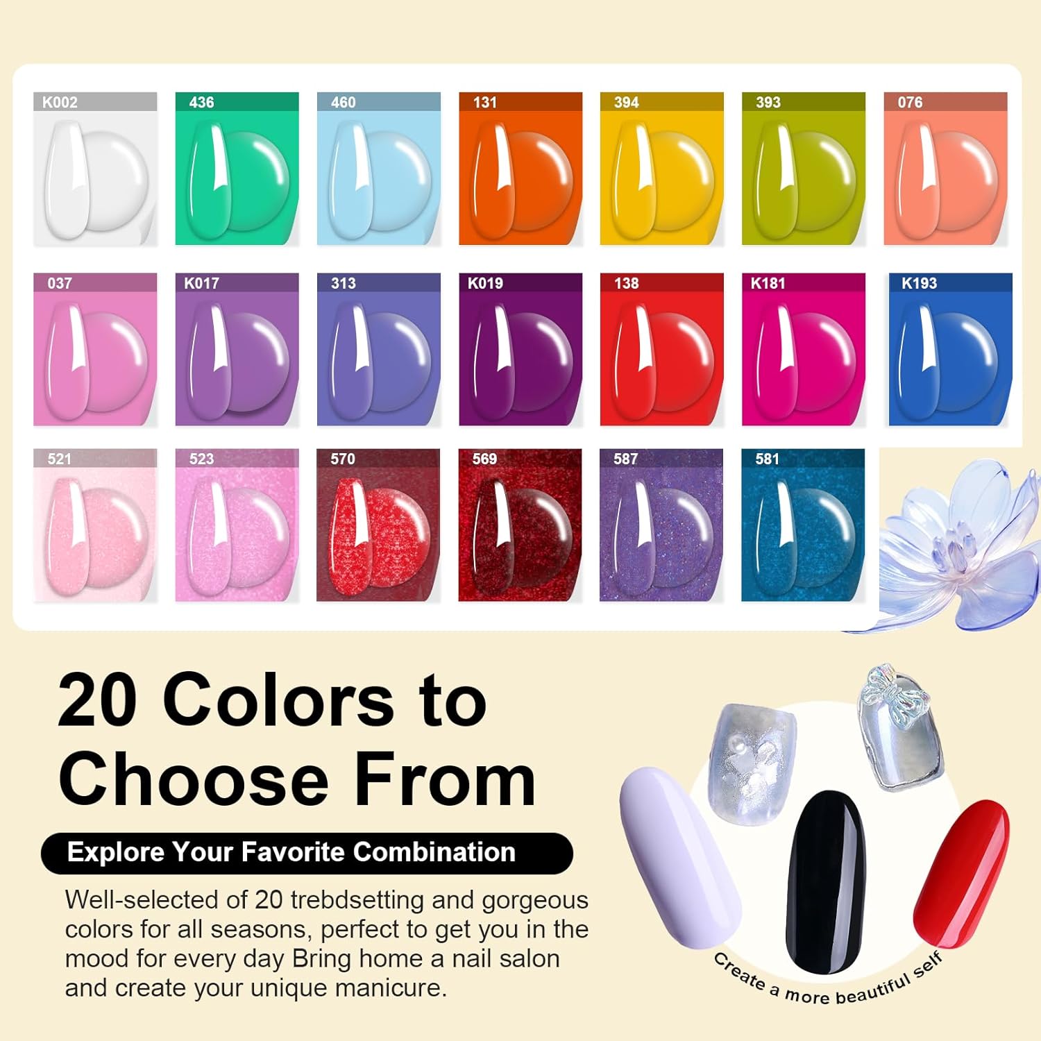 • 【What You Get】Dip Nails Powder Starter Kit including 20*0.35oz dip powder, 4*0.5floz dip liquid set, 1* Nail Brush, Cuticle Pusher*1, 1*Nail file, Substitute brush*2, Nail Stick*2. A kit containing all your nail art needs.