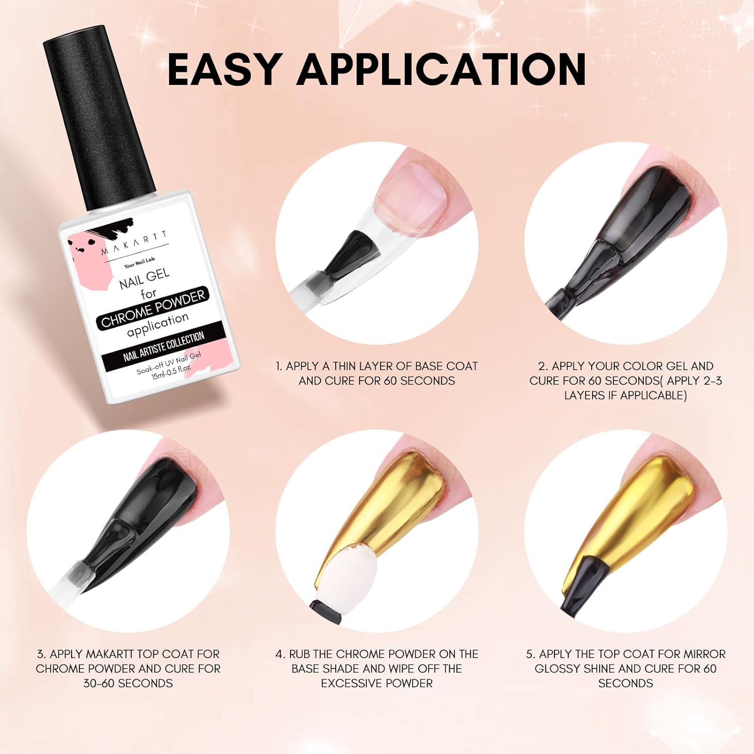 • Easy Application: Simply apply Makartt non-wipe gel top coat over your base color, cure for 30 seconds under an LED UV lamp, and then apply your favorite chrome or pearl powder. Finish by sealing with the top coat and curing under the lamp for 60 seconds to complete the look