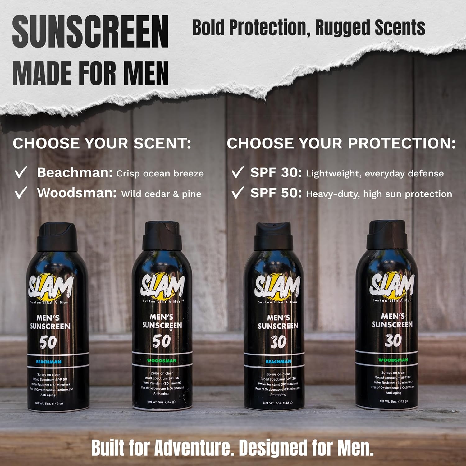 • Manly Teakwood Scented Sunscreen Spray: Embrace the rugged aroma of teakwood with this men’s sunscreen spray. Slam Lotion WoodsMan SPF 50 sun screen spray keeps you protected and smelling great on every outdoor adventure. The perfect size sunscreen spray.