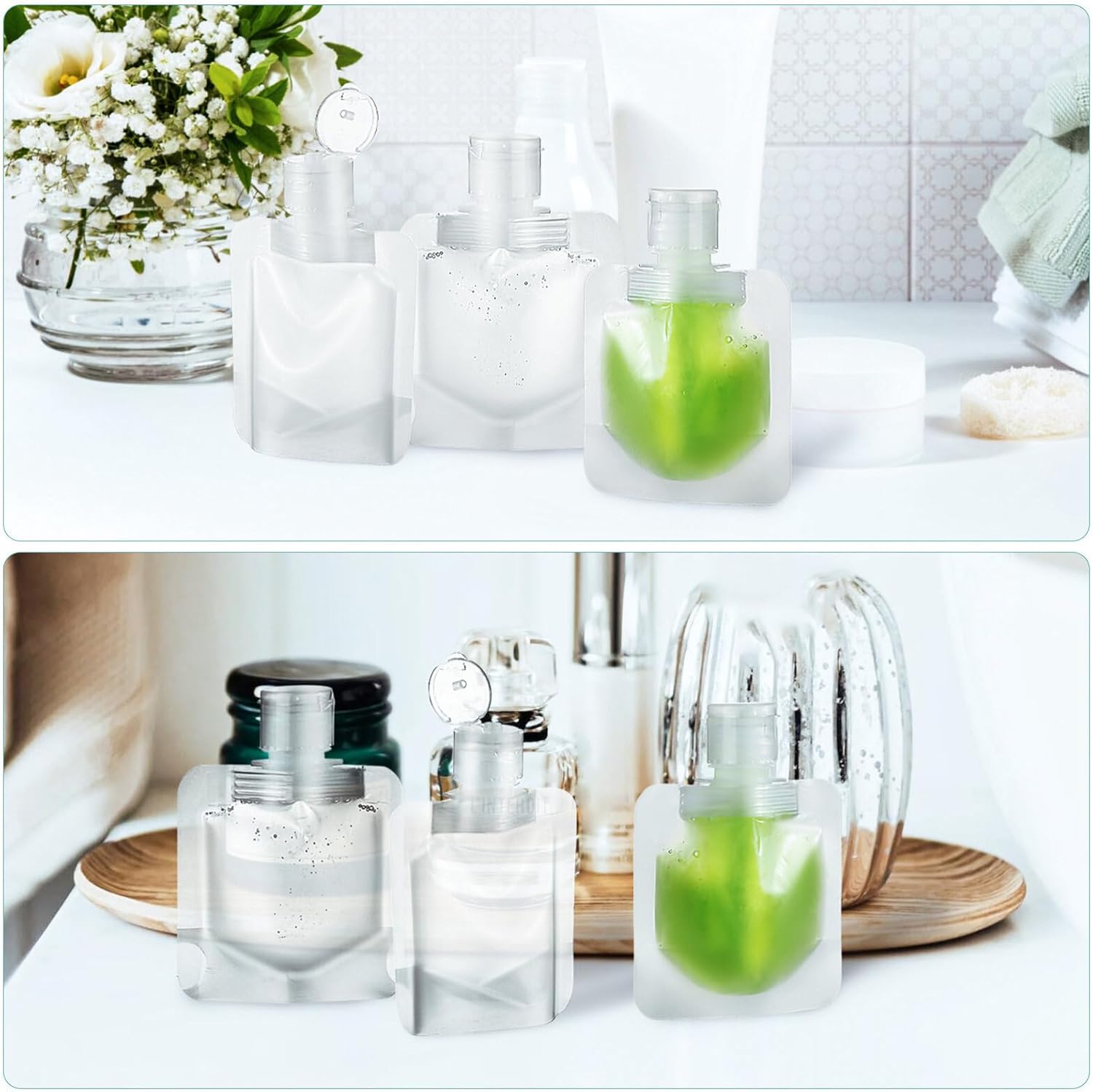 • Multi-Purpose: Our travel cosmetic containers pouches are suitable for kinds of lotions products. They can store gel, cream, lotion, shampoo, conditioner, essential oil, makeup water and so on