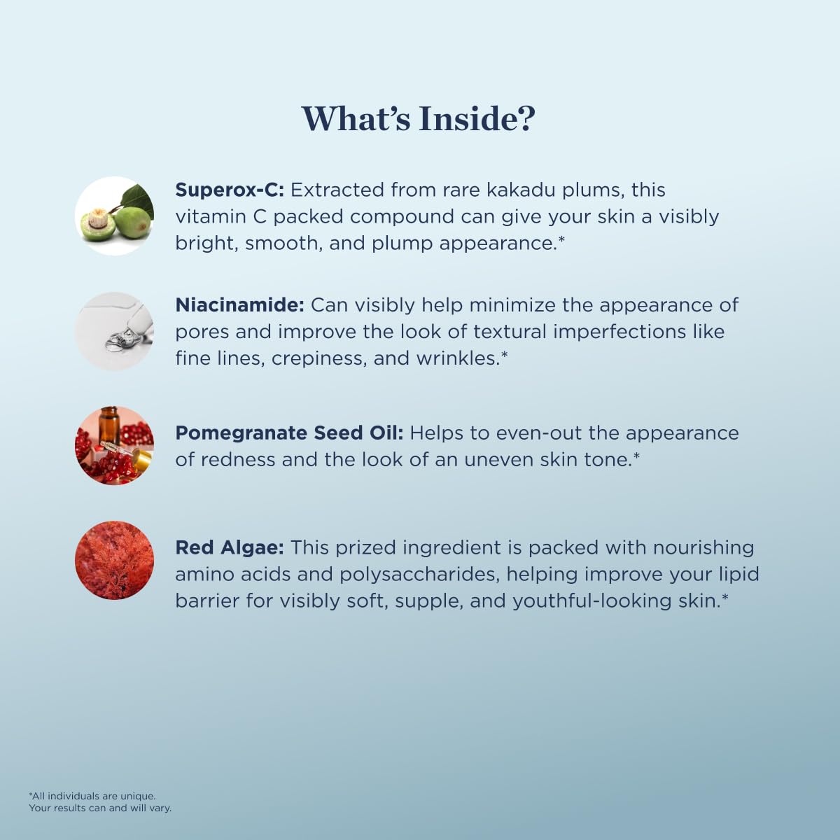 • PREMIUM INGREDIENTS: Each drop is packed with skin-beautifying agents, including Superox-C, Niacinamide, Pomegranate Seed Oil, and Red Algae.
