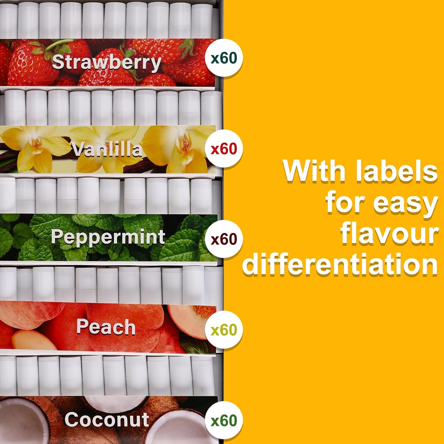 • ✅ 【5 Flavors Lip Balm】Our lip balm bulk contains 300 pack in 5 flavors -Peach, Mint, Strawberry, Coconut, and Vanilla. Labels are built into the box to help distinguish flavors