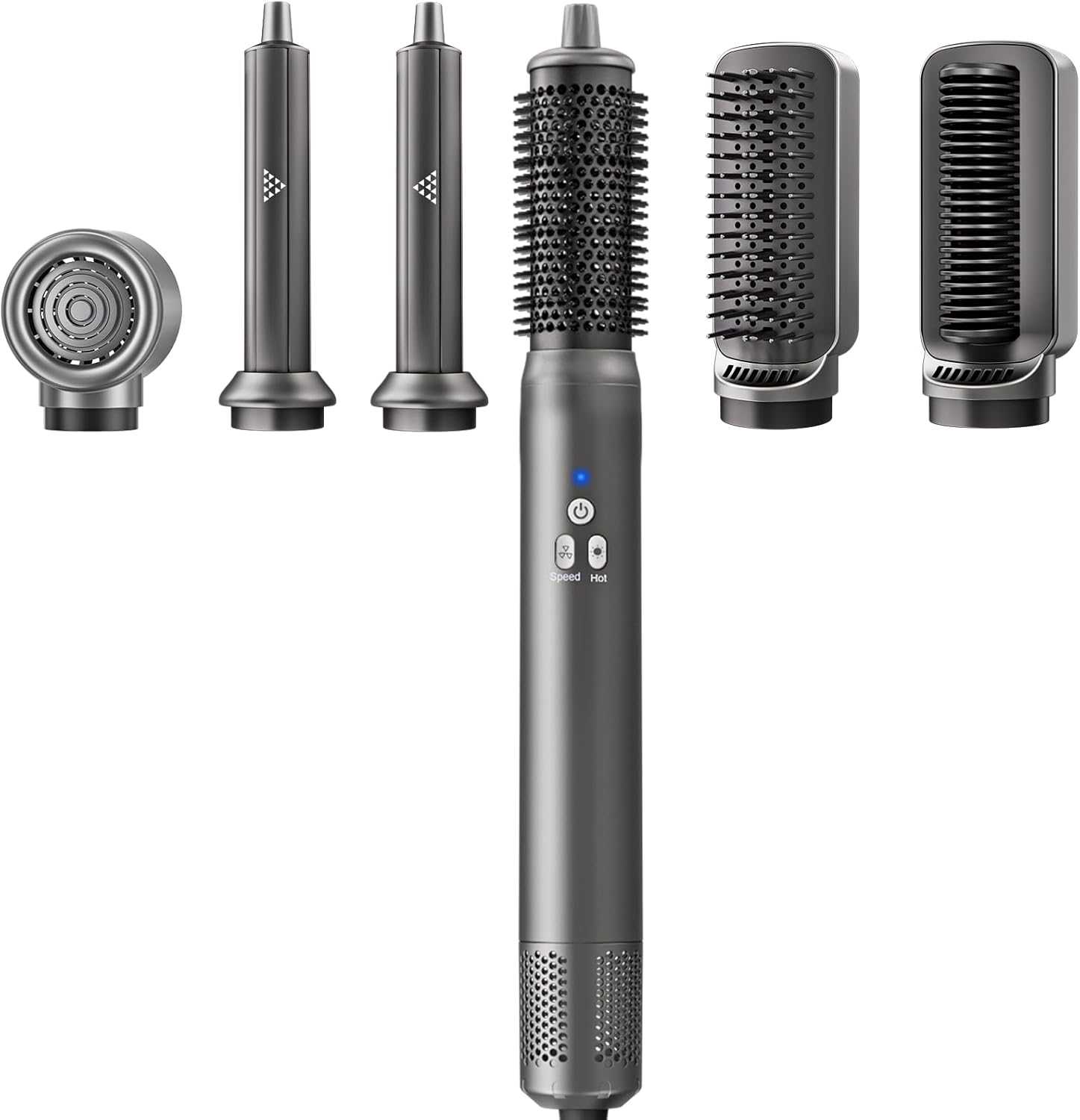 • 【UPGRADE 6 IN 1 AIR-WRAPS STYLING TOOLS】--Our multi versatile air styler can attach to the styling wand & hair dryer and give you the power to explore styles for any hair type.Hair Styler Brush includes 1x hair dryer for fast drying, 2 x 32mm left & right rotating curling iron for curling, 1x volumizing brush for volumizing, 1x hair straightener brush for smoothing and straightening ,1x sleeking brush for smoothing.