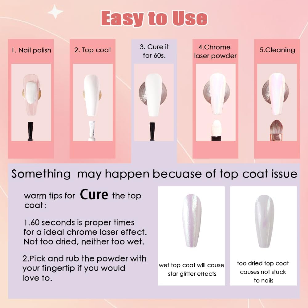 • Easy to Use: The laser chrome powder stuck well to the nails that applied No-wipe Top Coat. You can easily get salon-quality laser chrome results. To make it easy to use the powder, we provide detailed steps and tips in the images. Use it and try more DIY nails with chrome hearts nail charms, flatback rhinestones, and nail stickers.