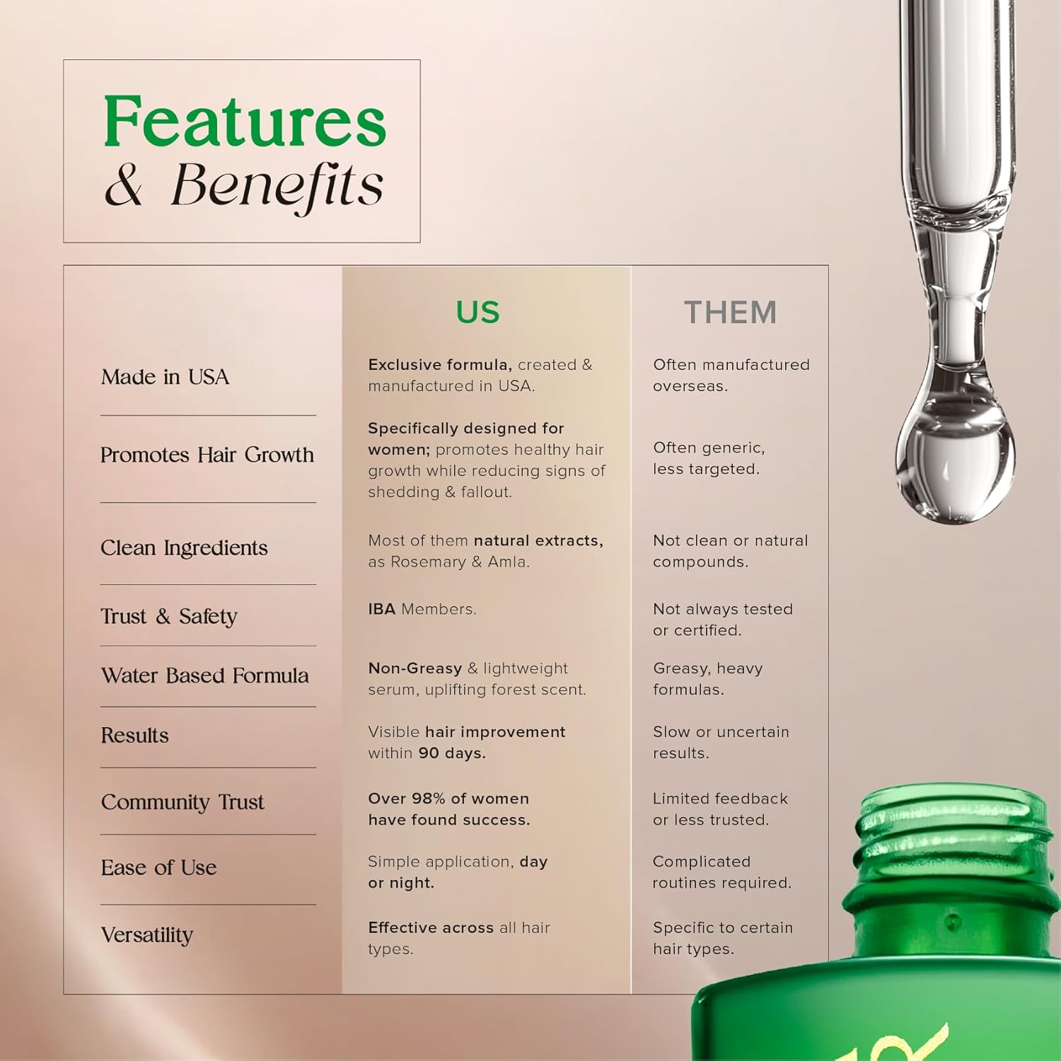 • LAB TESTED & IBA CERTIFIED MEMBERS: Made in the USA, developed by specialists & rigorously tested under strict laboratory conditions, our hair serum for hair growth is member of the International Beauty Association (IBA). Trusted by over 100,000 women & men, this formula is tailored to nourish hair, promoting a healthy, thick, & shiny appearance. Paraben Free & Sulfate Free.