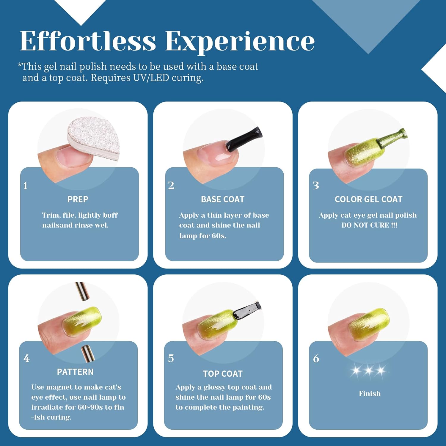 • Our blue cat eye gel nail polish is formulated to be long-lasting and durable. It can with stand daily wear and tear, ensuring that your manicure stays flawless for weeks. Say goodbye to chipped or faded nails with our high-performance gel formula.