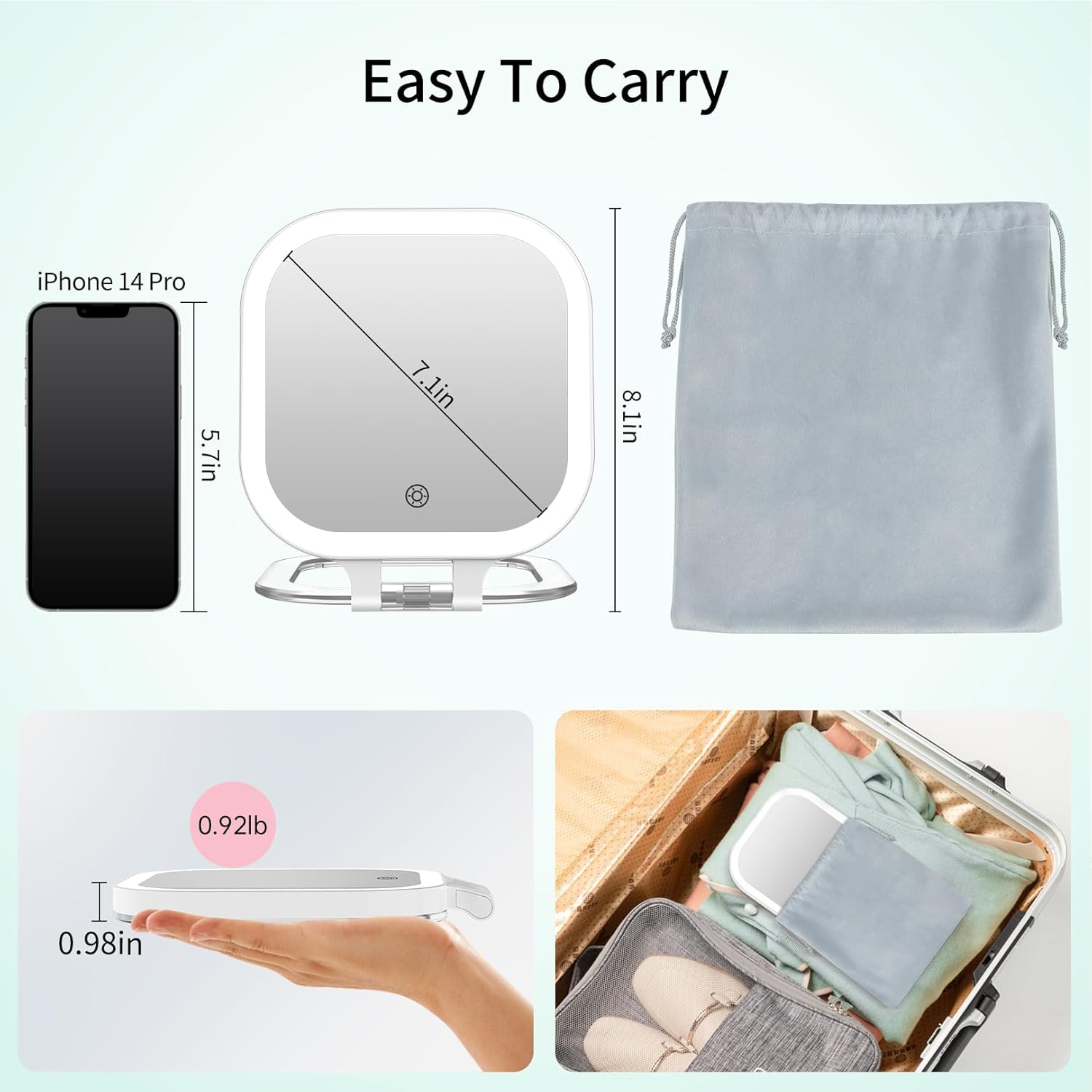 • 💝【FASCINATE 2025 Upgraded Travel Makeup Mirror】 In response to customer requests for a more travel-friendly magnifying makeup mirror, we have upgraded the 2000mAh rechargeable lithium battery. The travel mirror with light can be used for 6-10 days when fully charged. The travel mirror size is: 8.1 * 7.1 * 0.98 inch, weights only 0.9 lb, which is enough to meet your makeup and touch-up needs for daily commuting and 2-3 days of business or travel.