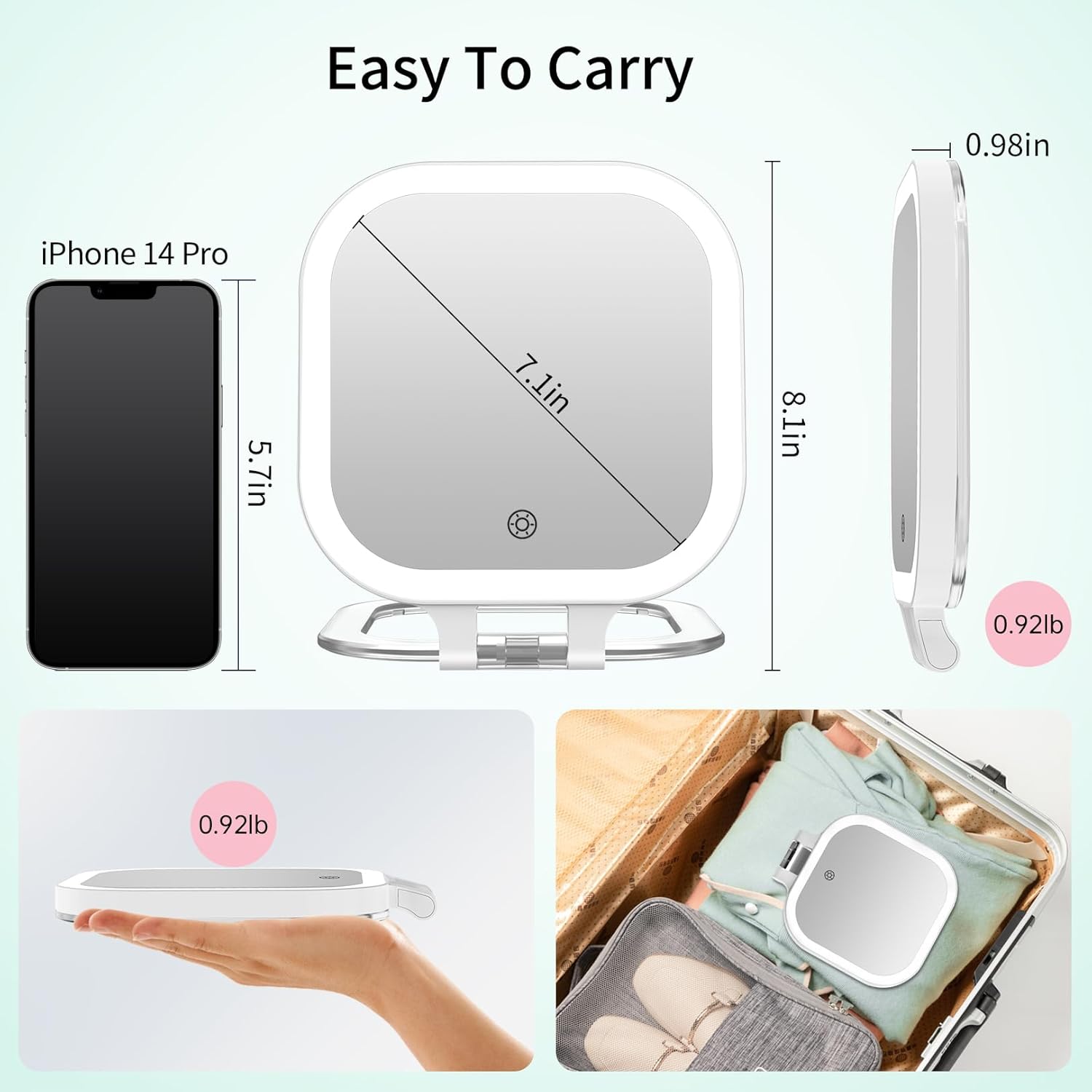 • 💝【FASCINATE 2025 Upgraded Travel Makeup Mirror】 In response to customer requests for a more travel-friendly magnifying makeup mirror, we have upgraded the 2000mAh rechargeable lithium battery. The travel mirror with light can be used for 6-10 days when fully charged. The travel mirror size is: 8.1 * 7.1 * 0.98 inch, weights only 0.9 lb, which is enough to meet your makeup and touch-up needs for daily commuting and 2-3 days of business or travel.