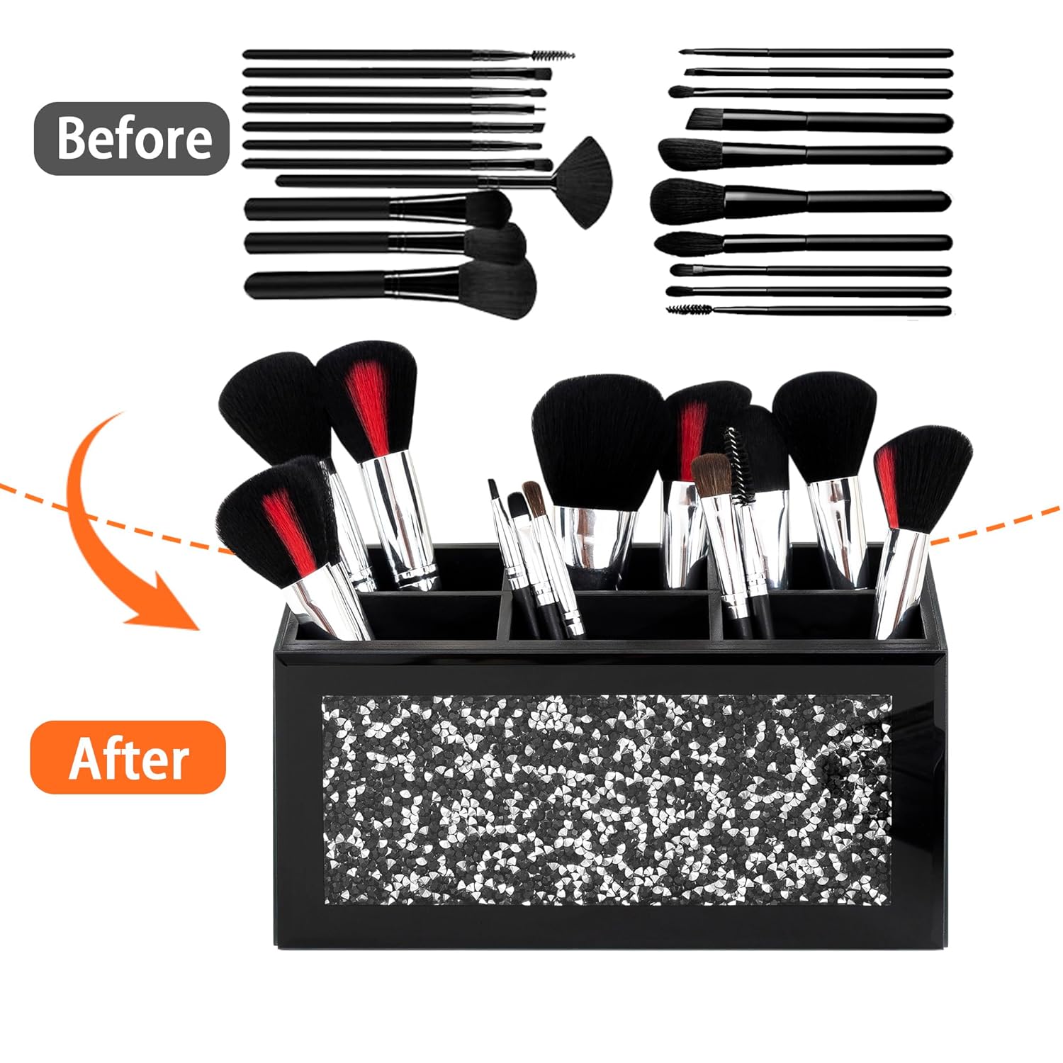 • Sleek Black Design with Crystal Detailing: The SHYFOY Makeup Brush Holder in a elegant black glass finish is perfect for adding a touch of glam to your bathroom. The 6-slot design, combined with front-facing crystal embellishments, offers an elegant solution for organizing your beauty essentials.