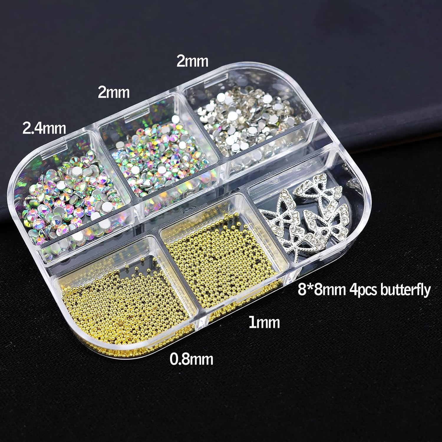 • 【Mix Nail Rhinestones】In another rhinestones box,there is mixing gold nail beads,AB color and white nail gems. There are 4pcs butterfly in small size,which you can apply on long acrylic nails or short nails.