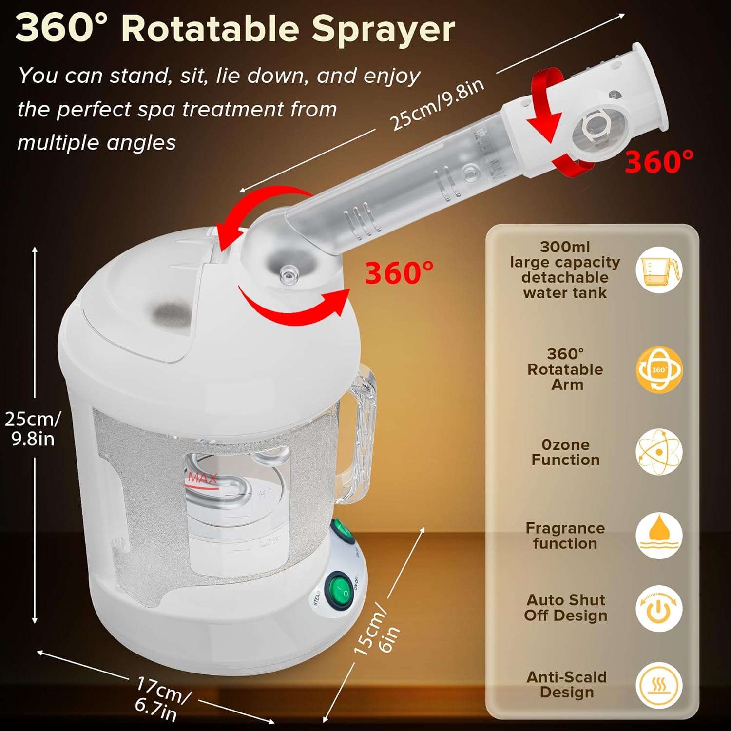 • 【360° Rotating Sprayer】: The sprayer angle can be adjusted according to your needs, you can lie, stand, sit, you just need to stay there in the most relaxing and comfortable way to enjoy the perfect facial spa. Keep your face at least 8 inches from the nozzle to avoid burns.