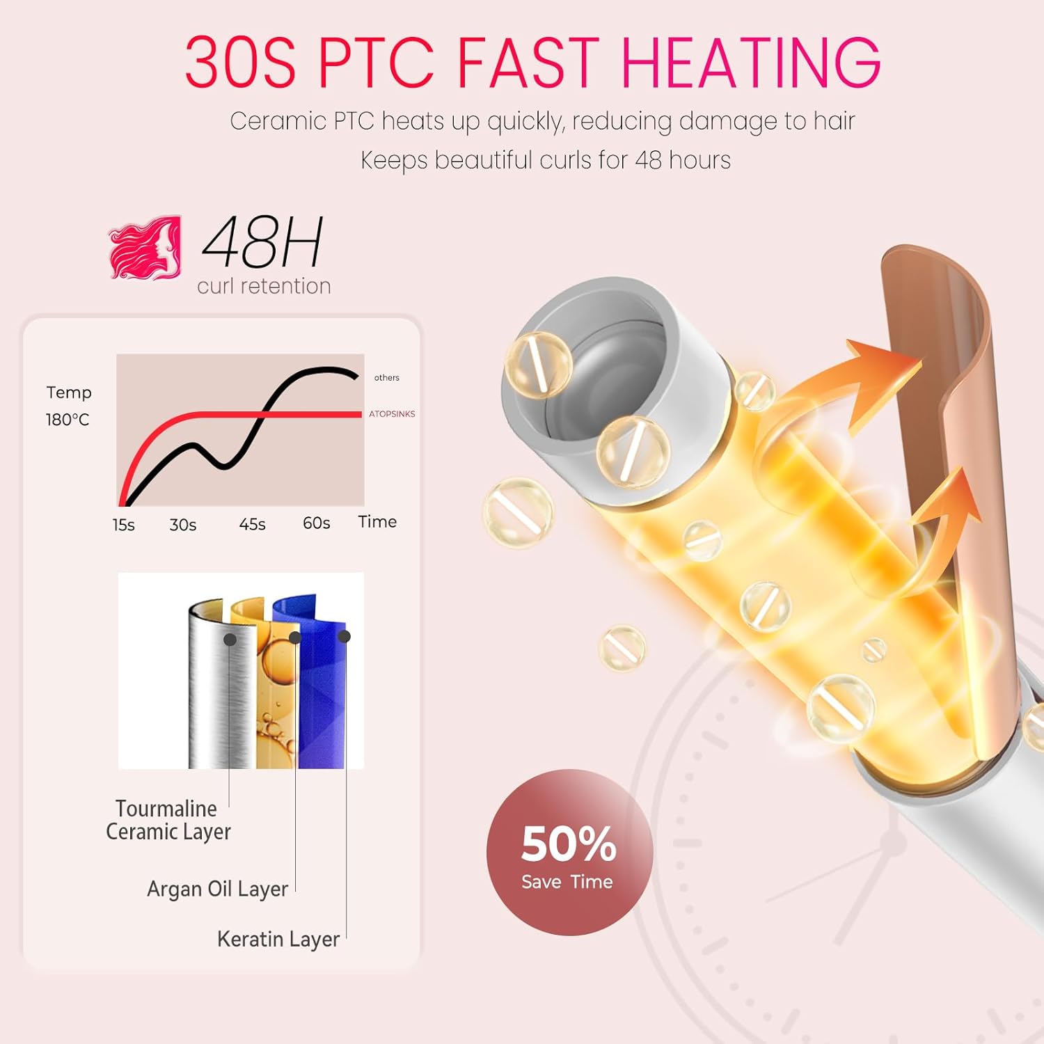• RAPID 30-SECOND HEATING WITH PTC TECHNOLOGY: Atopskins mini curling iron heats up in just half a minute for quick styling; Travel curling iron advanced ceramic coating ensures even heat distribution for long-lasting curls; No more waiting around with slow heating travel hair curler
