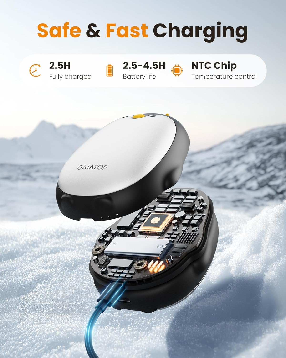 • Long-Lasting Hand Warmers Rechargeable: The reusable electric hand warmer built-in rechargeable batteries, battery life last about 2.5-4.5 hrs, comes with 2 usb cables, the wamer can be fully charged at the same time within 2.5 hrs