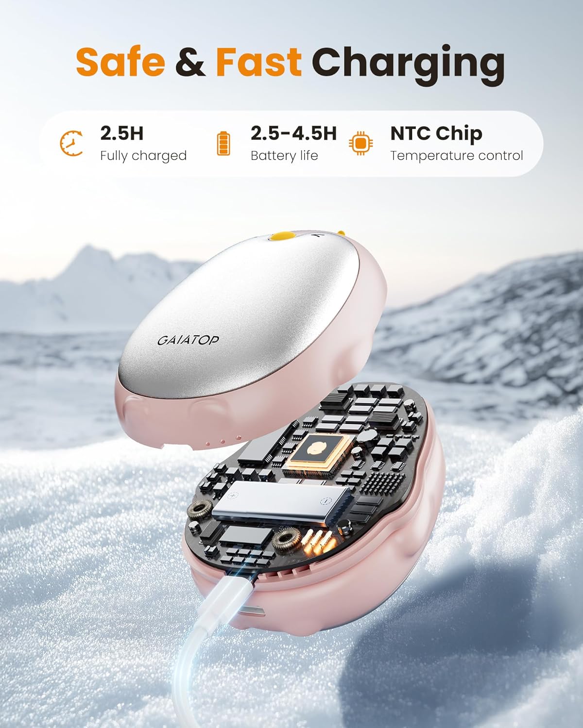 • Long-Lasting Hand Warmers Rechargeable: The reusable electric hand warmer built-in rechargeable batteries, battery life last about 2.5-4.5 hrs, comes with 2 usb cables, the wamer can be fully charged at the same time within 2.5 hrs