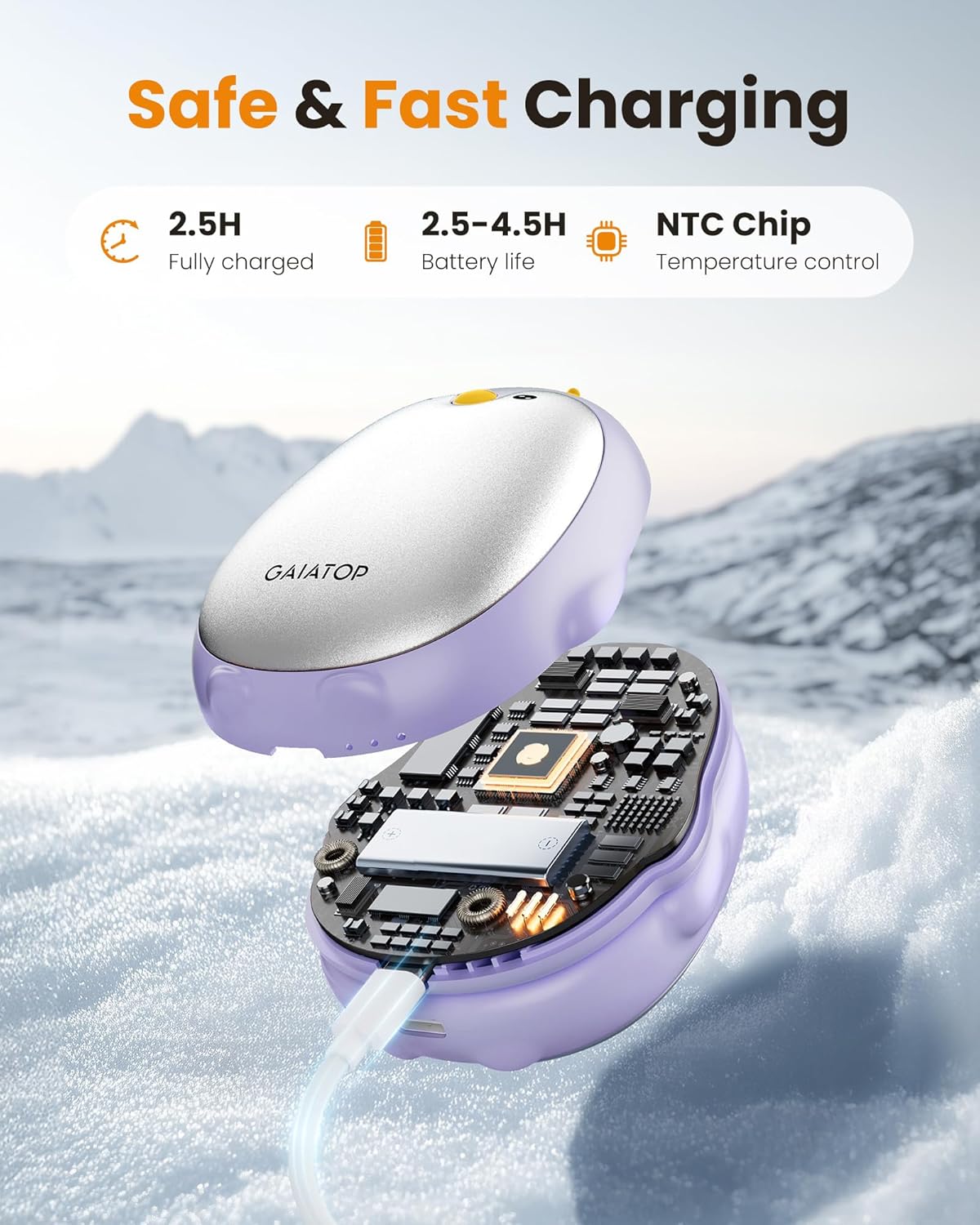 • Long-Lasting Hand Warmers Rechargeable: The reusable electric hand warmer built-in rechargeable batteries, battery life last about 2.5-4.5 hrs, comes with 2 usb cables, the wamer can be fully charged at the same time within 2.5 hrs