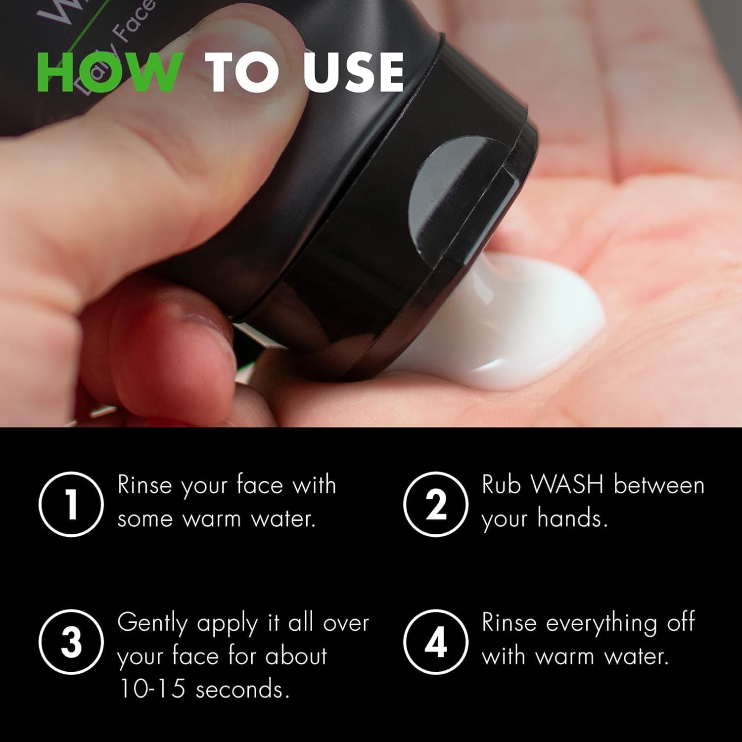 • How to Use: First, rinse your face with some warm water. Then squeeze a nickel-size amount of WASH onto your fingers. Briefly rub your hands together to spread it out, then gently apply it all over your face for 10-15 seconds, avoiding your eyes and mouth. After cleansing, rinse off with more water. Use once in the morning and at night.