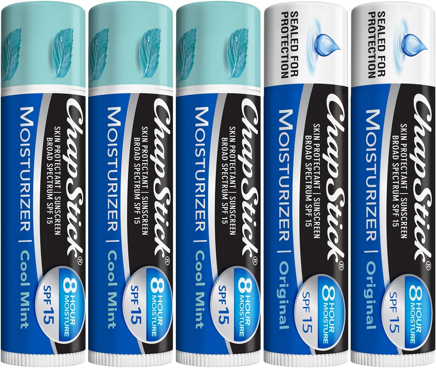 ChapStick Lip Balm Moisturizer 2-in-1 Lipcare SPF 15 Bundle – Cool Mint 3-Pack + Original 2-Pack, 0.15 Oz Ea (5 Piece Set)