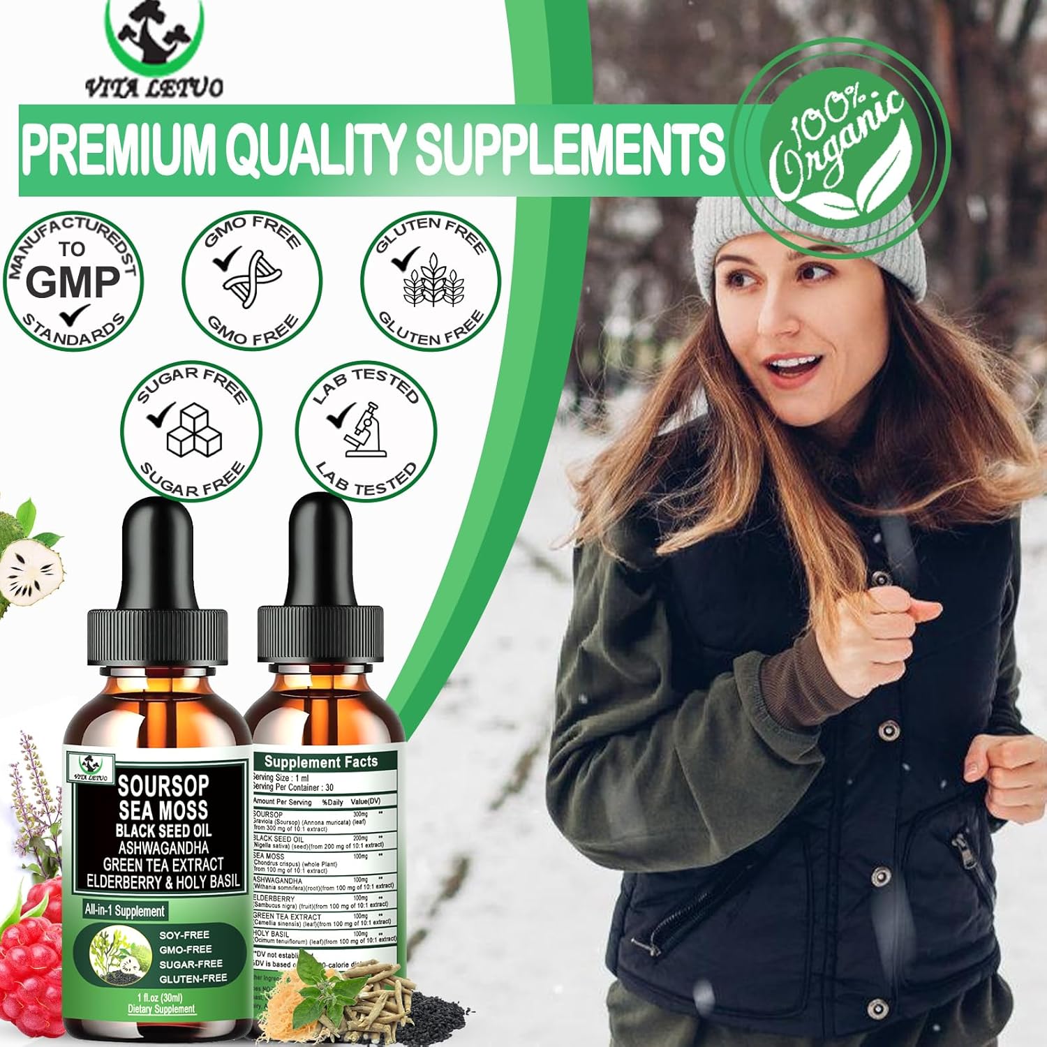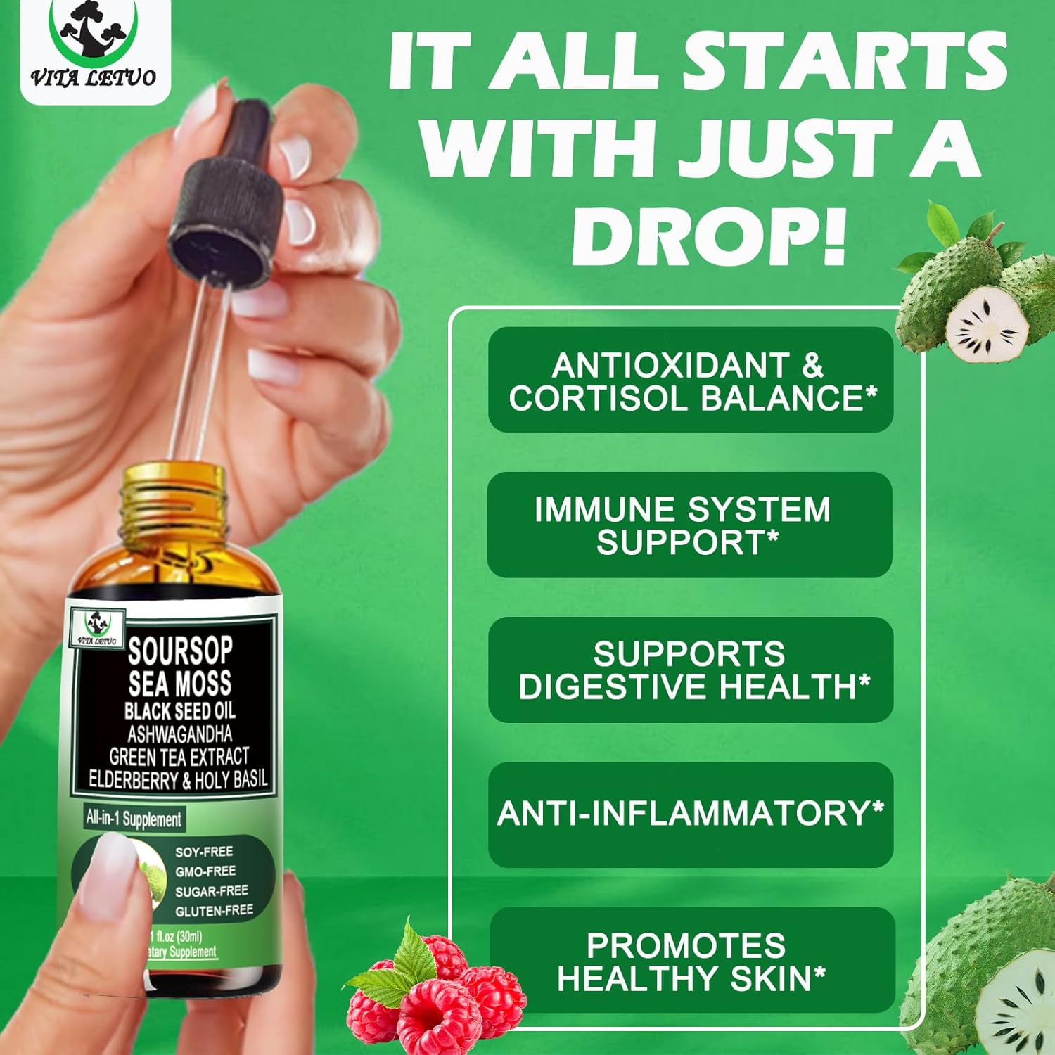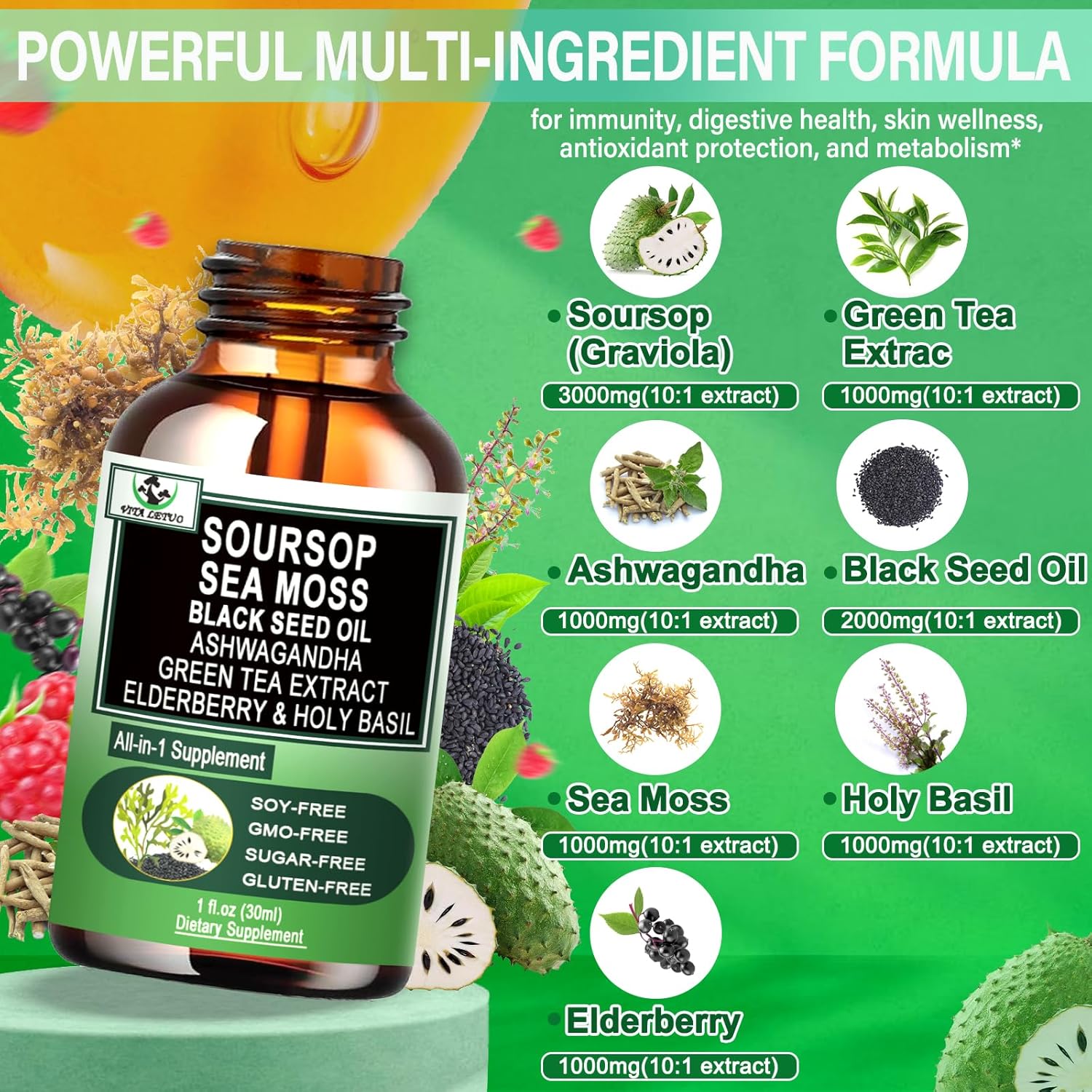 • WHY OUR SOURSOP? Our premium Soursop Liquid Drops combines the potent benefits of Seamoss, Black Seed Oil, Elderberry, Holy Basil, Green Tea Extract, and Ashwagandha for a comprehensive immune boost and optimal wellness. Unlike traditional Soursop Bitters supplements, our formula works synergistically to enhance antioxidant protection, support digestion, detoxify the body, and improve energy levels.* Experience the full power of nature with a supplement that offers balanced, all-around health support, helping you stay vibrant, energized, and immune-strong—naturally.