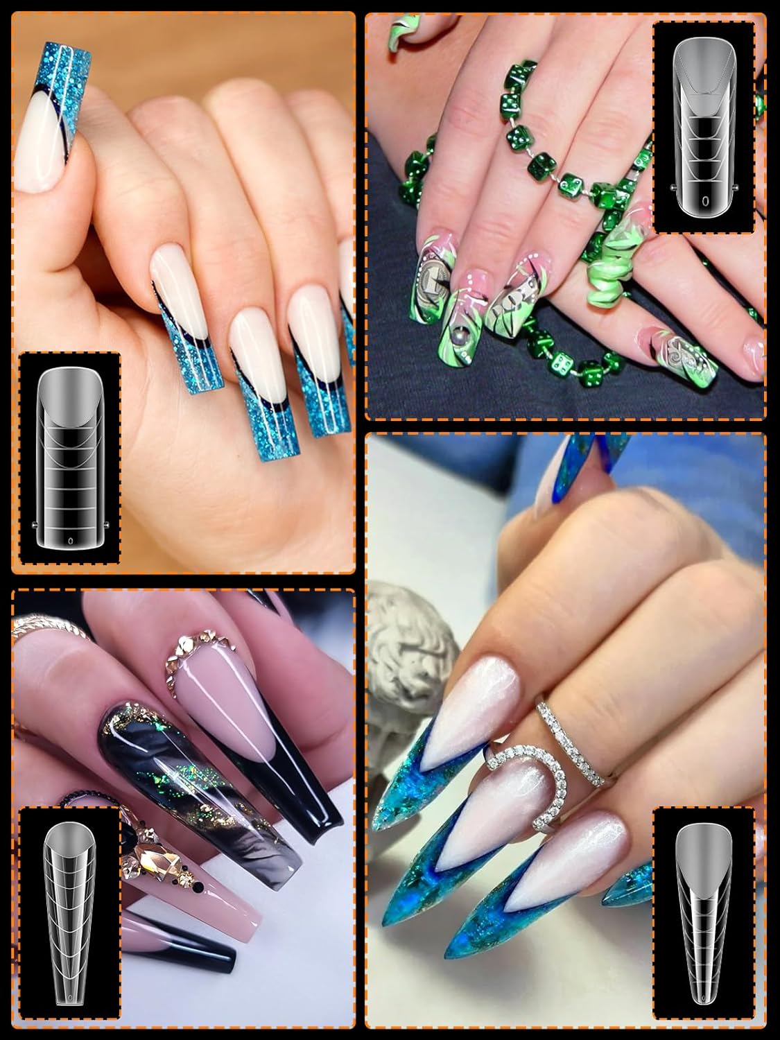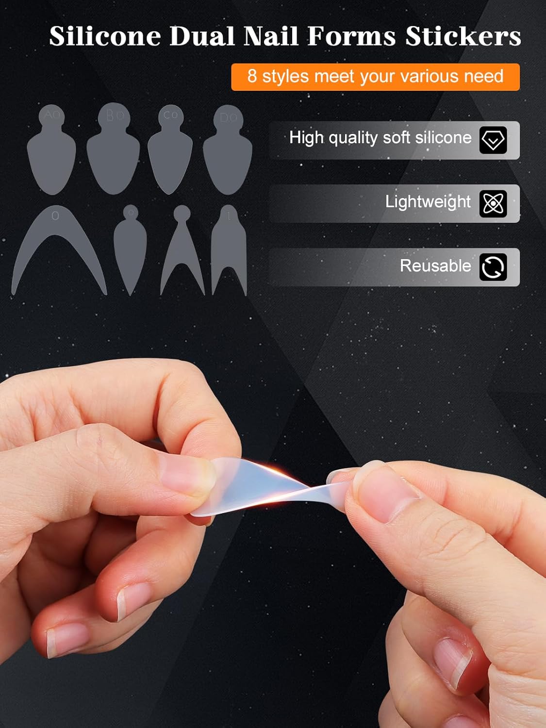 • 【8 Shapes with 12 Sizes】Both dual nail extension molds tips and French dual sticker silicone pads come in 8 style shapes and 12 sizes, each is engraved with numbers "0-11" for easy to recognize,which is convenient for you to design the nail length you want. And each size of long nail tips is separated by a small grid, a total of 12 grids, so they're easy and convenient to choose the suitable size to meet your nail's need