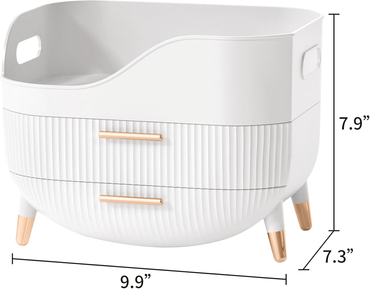 • Appearance and size:9.9”L×7.3”W×7.9”H,Large capacity cosmetic organizer with 2 drawers and top compartment,can organize tall bottles of skincare and cosmetics,Household containers for storing and organizing makeup