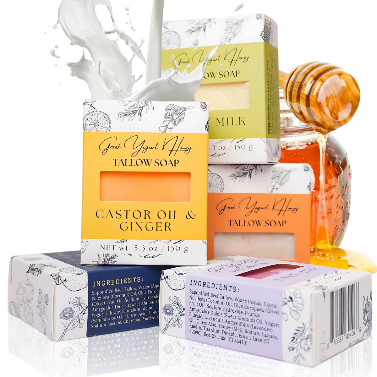 Greek Yogurt & Honey Tallow Soap Bar - Cold pressed handmade natural soap bars for face & body | Charcoal, Lavender, Oat & Honey, Castor Oil & Ginger, Goat Milk for Men and Women, 5 oz (pack of 5)