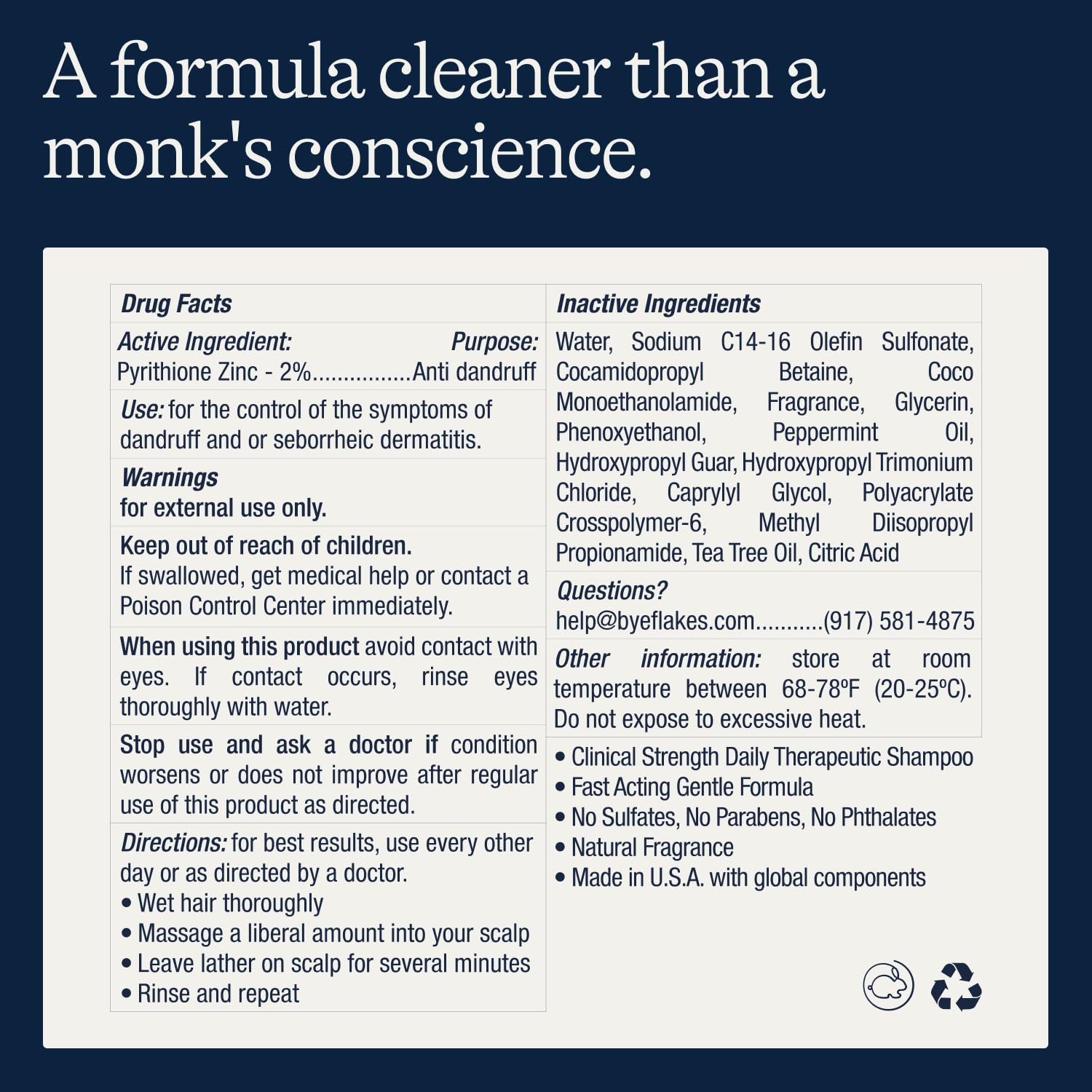 • A Formula Cleaner Than a Monk's Conscience: No sulfates, no parabens, no PEGs, no harsh ingredients that actually make dandruff worse. We designed a formula to stop dandruff and strengthen hair because no one should be worried about hair loss, a flaky scalp, or wearing black shirts.