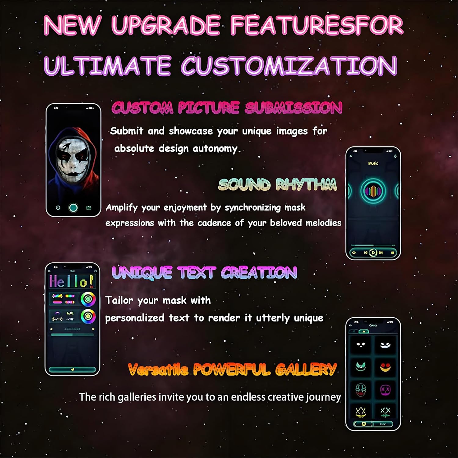 • DIY Your Mask Pattern:The cool mask supports app control.You can diy your digital mask pattern through the phone.You can also edit dynamic text and synchronize music rhythm.Through your imagination,you can become the coolest and most special focus