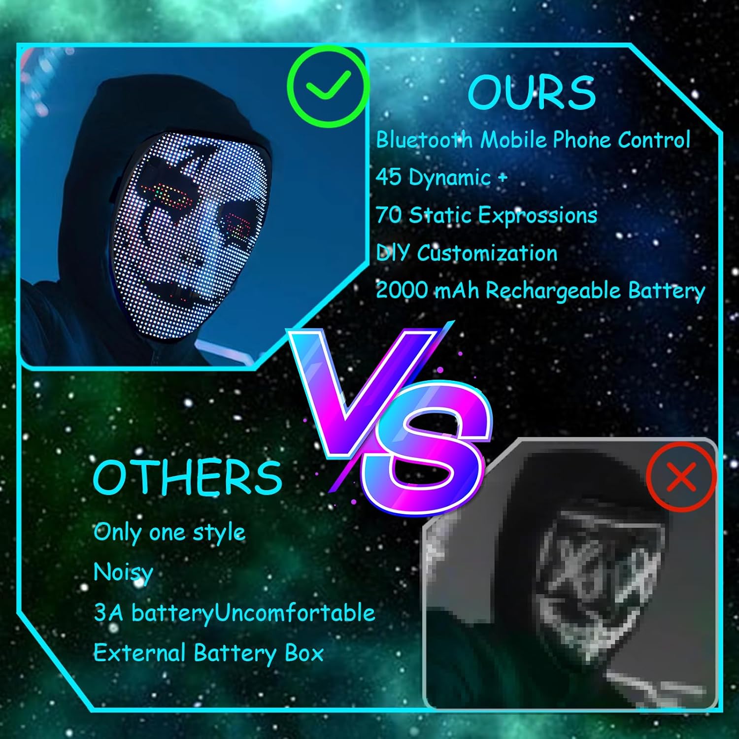 • Led Mask With 115 Patterns:Light up mask has 45 groups of dynamic patterns and 70 groups of static patterns,The mask uses higher brightness 2074 pieces of 2121RGB led light beads,Unique shape with gorgeous Led lights,making you stand out from the crowd