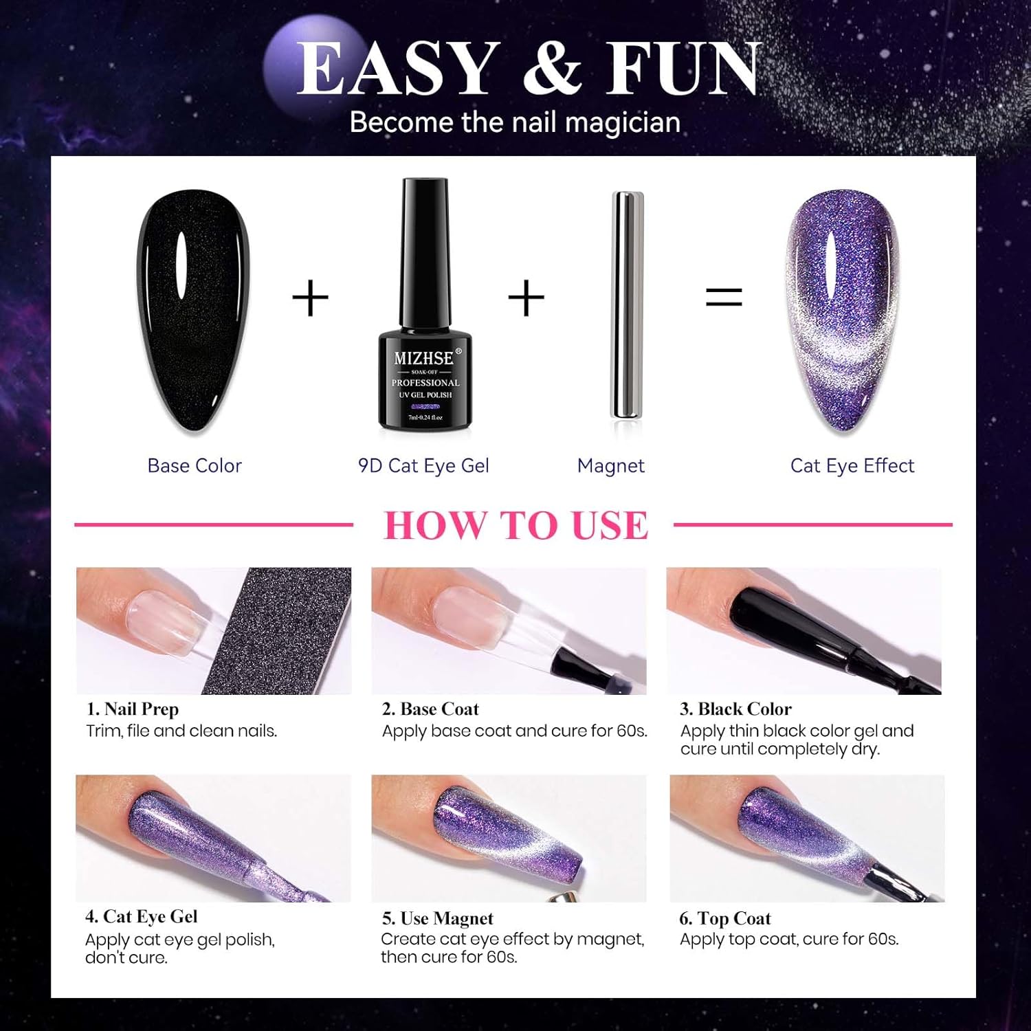 • MIZHSE Aurora Cat Eye Gel Nail Polish: Purple magnetic gel polish, 1 magnet stick. Enjoy the DIY fun of nail beauty at home. Suitable for natural nails, false nails, acrylic nails, etc.