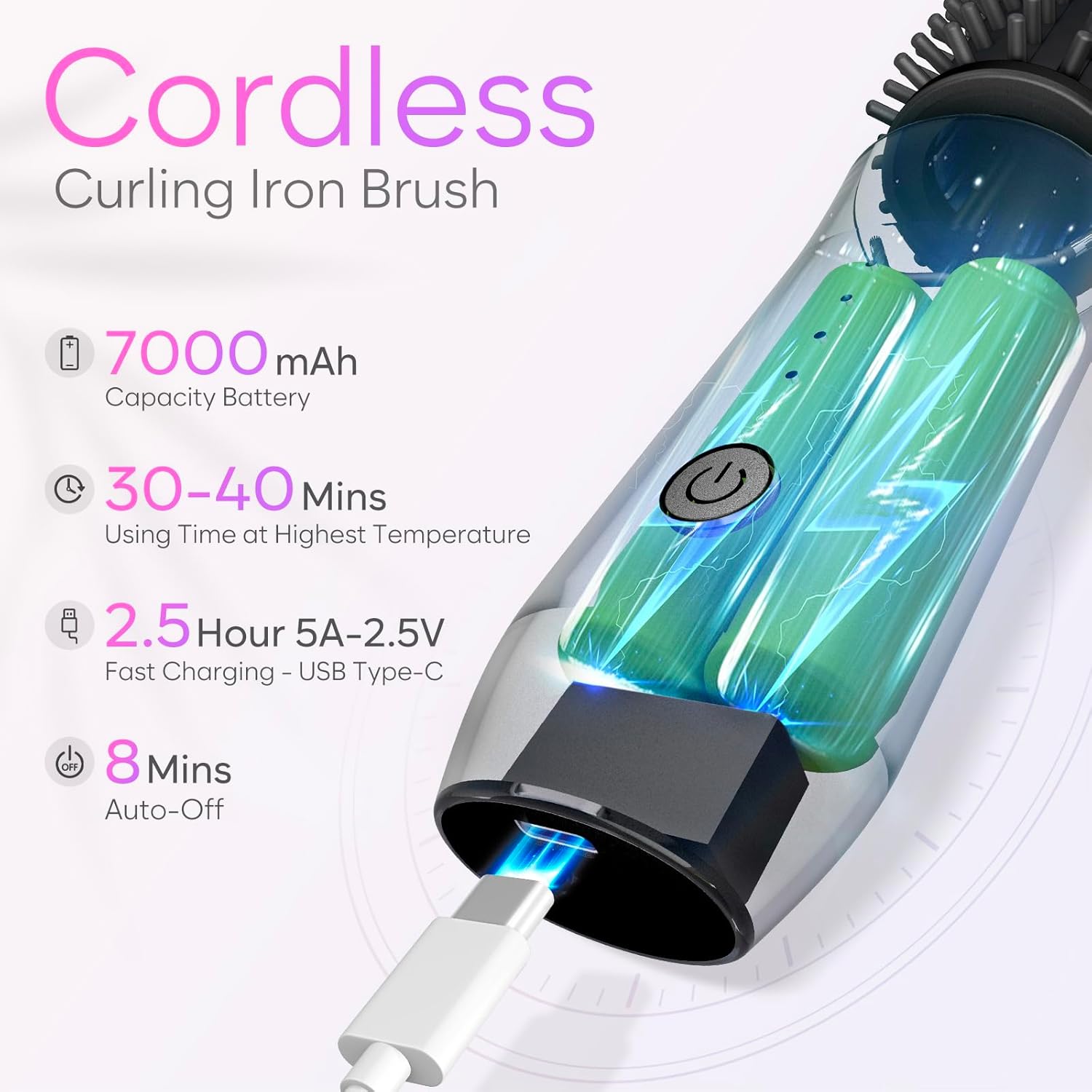 • 【Cordless & Portable】: This cordless curling iron brush features a wireless design, making it compact and easy to carry. It operates without the need for a power outlet, allowing you to style your hair conveniently when you're out and about.