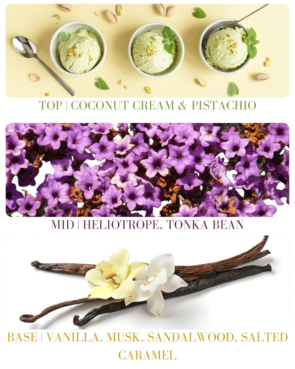 • SCENT PROFILE - TOP: Coconut Cream, Pistachio, MID:Tonka Bean, Heliotrope, BASE: Exotic Vanilla Musk, Sandalwood, Salted Caramel