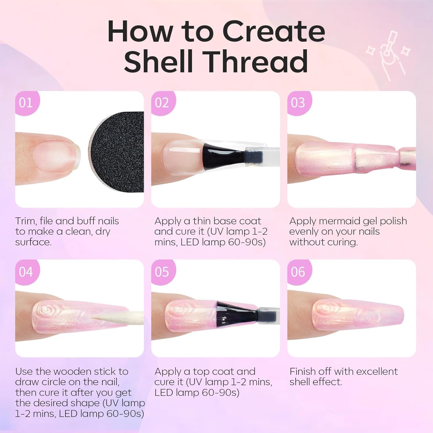 • NOTE: It is normal for the gel to be a little sticky, in order to better draw the thread effect. Use the Dotting Pen to create a Swirl Shell Thread effect for a truly magical look!