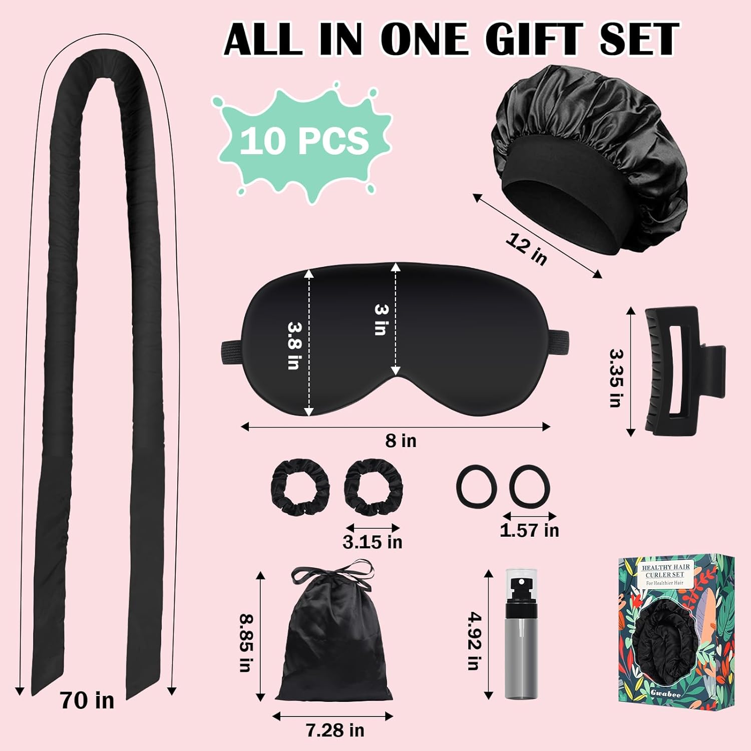 • Thoughtful Set for Women: Our heatless curling set includes 10 items: 1 x 70-inch long satin curling rod headband, 1 x satin hair bonnet for sleep, 1 x silk satin sleep eye mask, 1 x hair clip, 2 x satin hair ties, 2 x elastic hair ties, 1 x satin storage bag, and 1 x spray bottle. This all-in-one curling rods set is packaged in an exquisite box, making it the perfect present for your wife, mother, daughter, friends, or colleagues